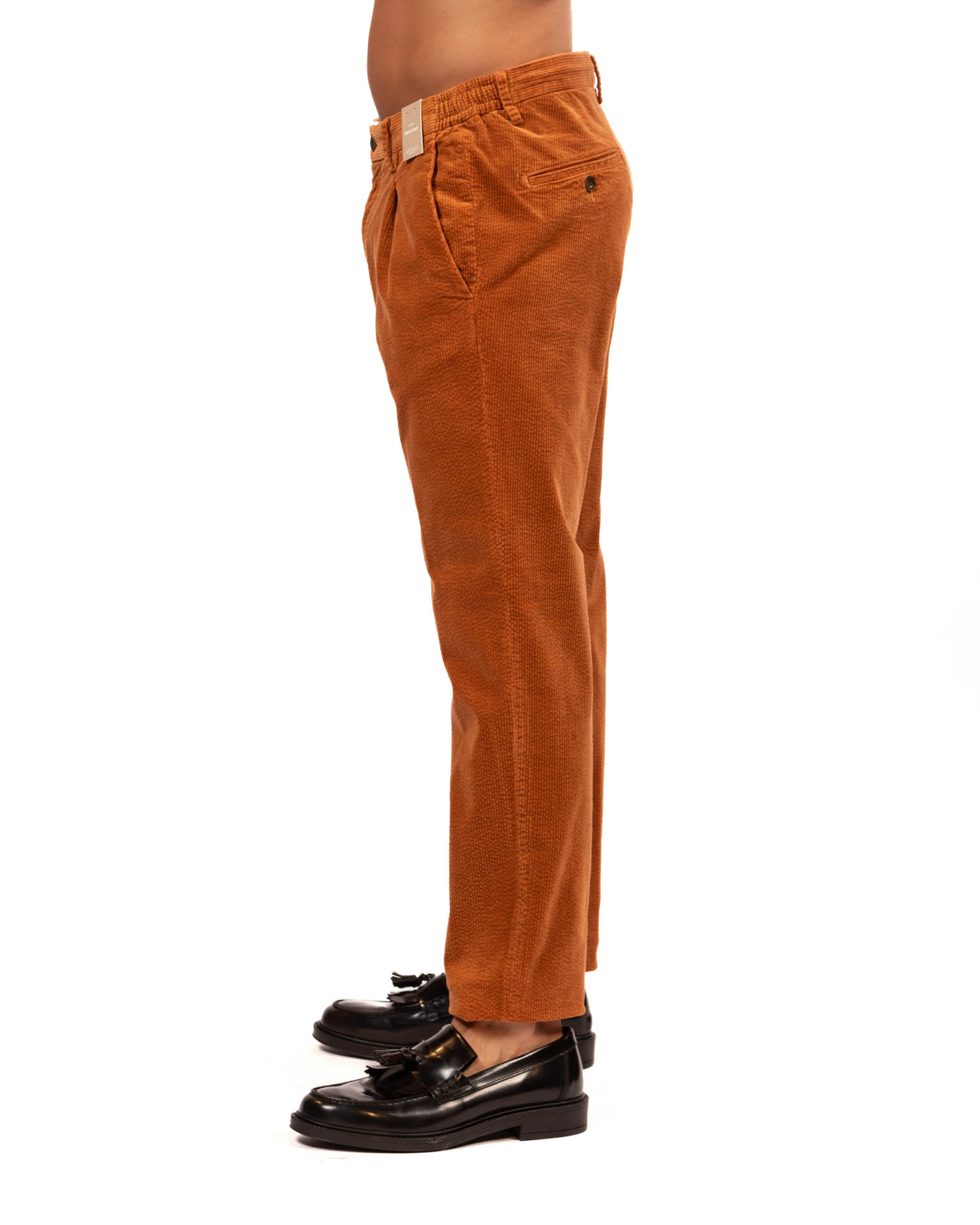 Il pantalone Berlino, realizzato in velluto di cotone stretch, unisce comfort e praticità grazie alla vita elasticizzata e alla coulisse interna regolabile. Completano il design le tasche laterali e le tasche a filetto sul retro.