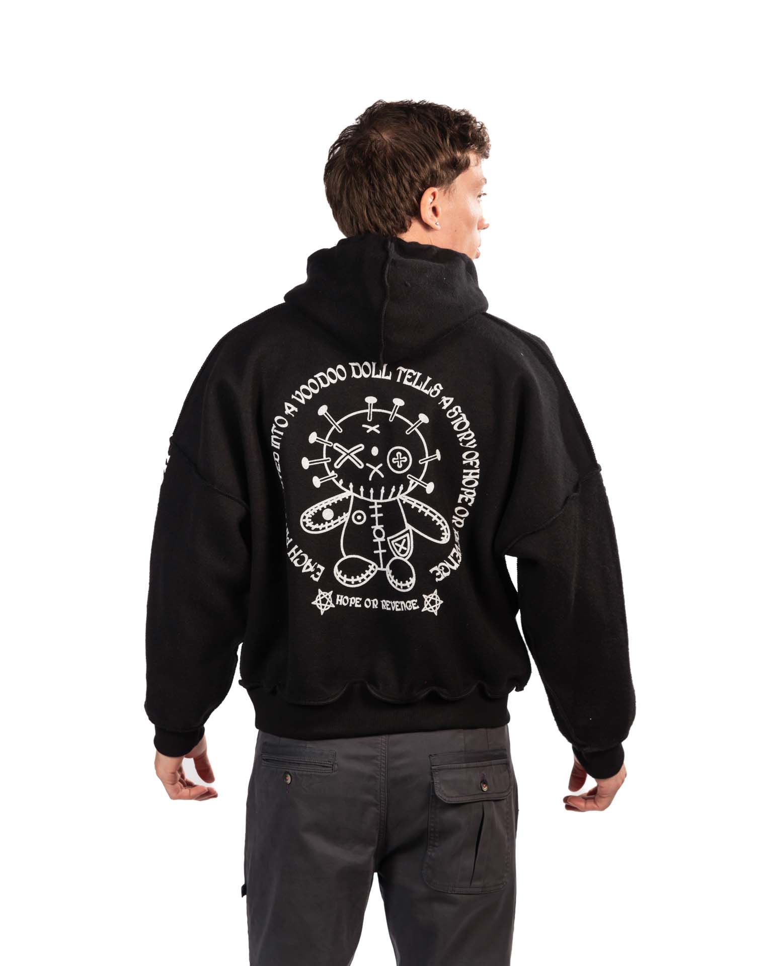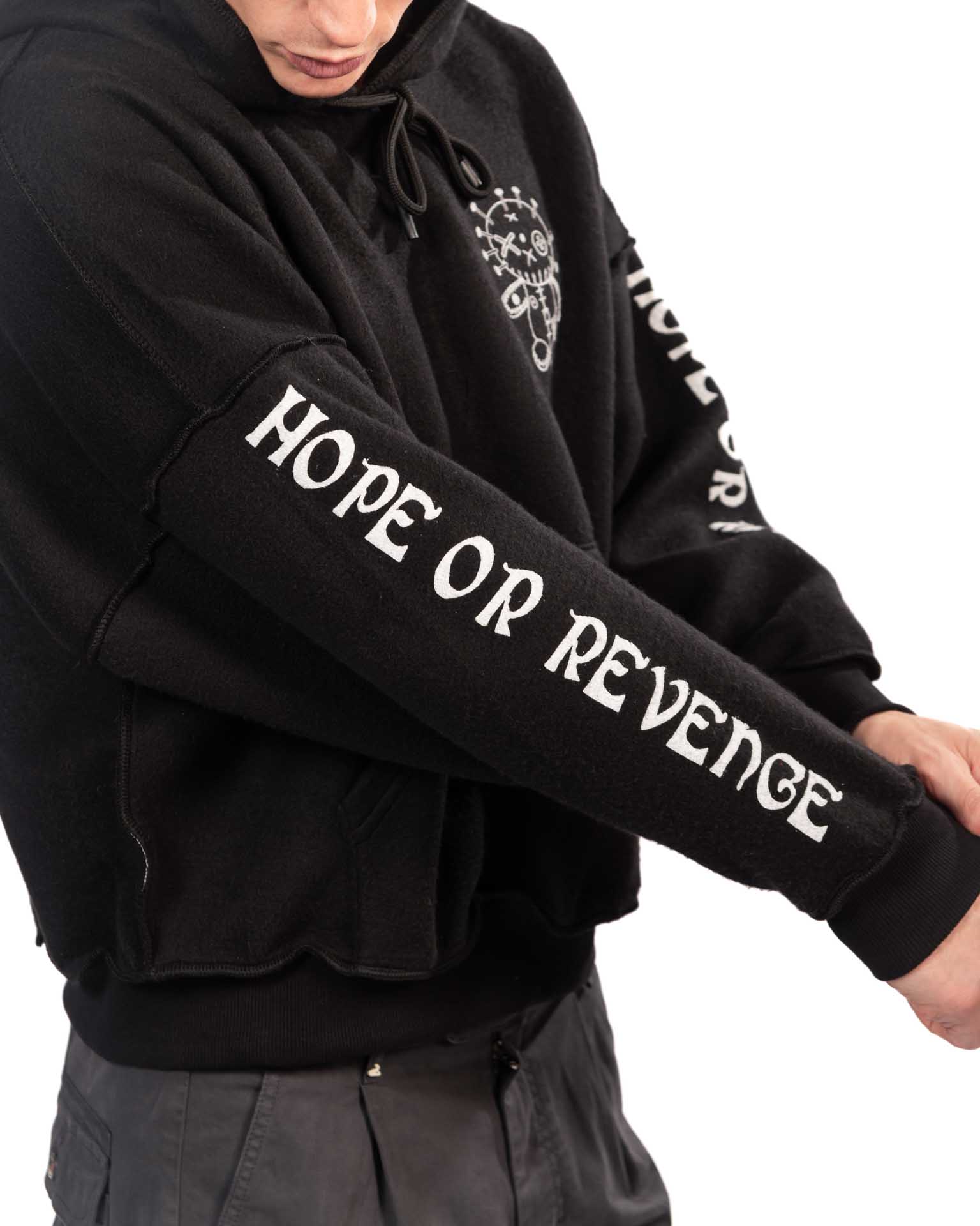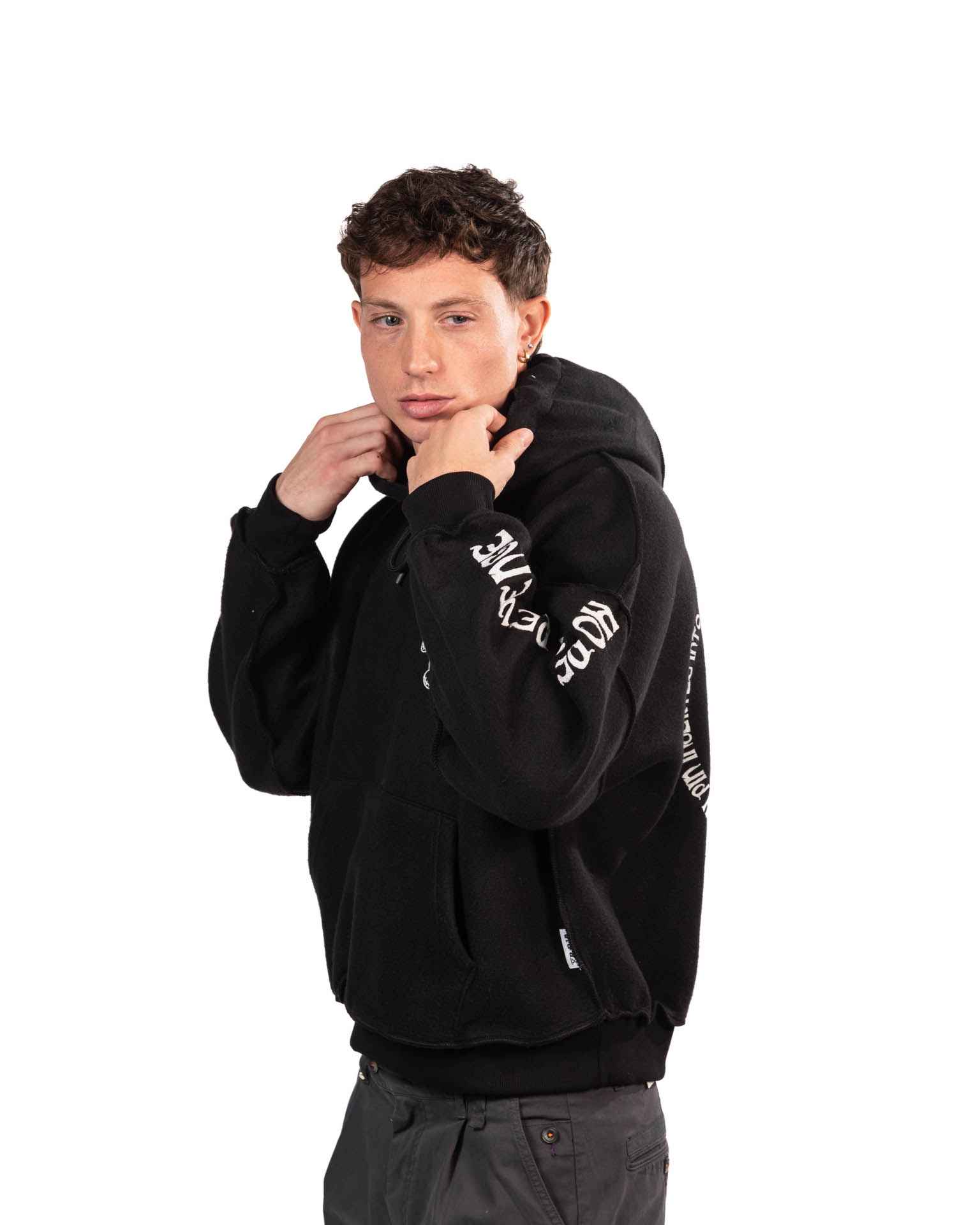 Realizzata in morbido cotone con interno garzato, offre comfort e calore ideali per la mezza stagione e le giornate più fresche. Il design total black è valorizzato da stampe grafiche a contrasto sulla manica e sul retro, che aggiungono un tocco audace e originale.
