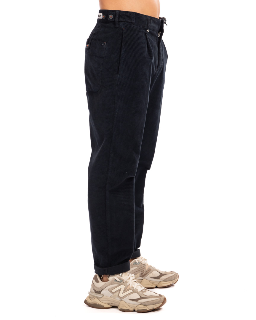 Pantalone cropped modello Camp Nou con pinces. Chiusura centrale con bottoni e zip nascosta. Spilla logo applicata sul fronte. Tasche posteriori asimmetriche con bottone e cuciture a contrasto. Vita con bottoni e cinturini decorativi. Etichetta logo applicata in vita.