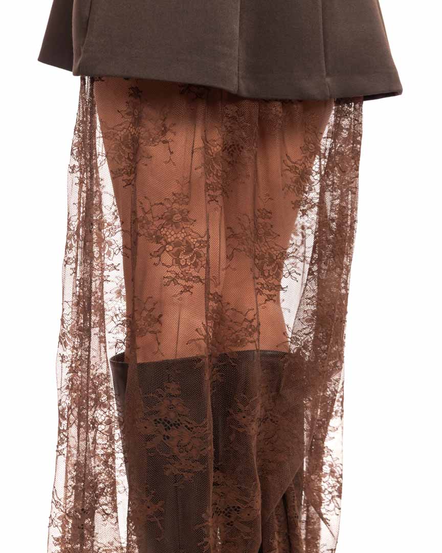 Elegante e femminile, questo abito marrone combina una parte superiore a tubino che valorizza la figura con una gonna in pizzo svasata, che dona movimento e raffinatezza. Un modello sofisticato, ideale per chi ama uno stile romantico ma moderno.