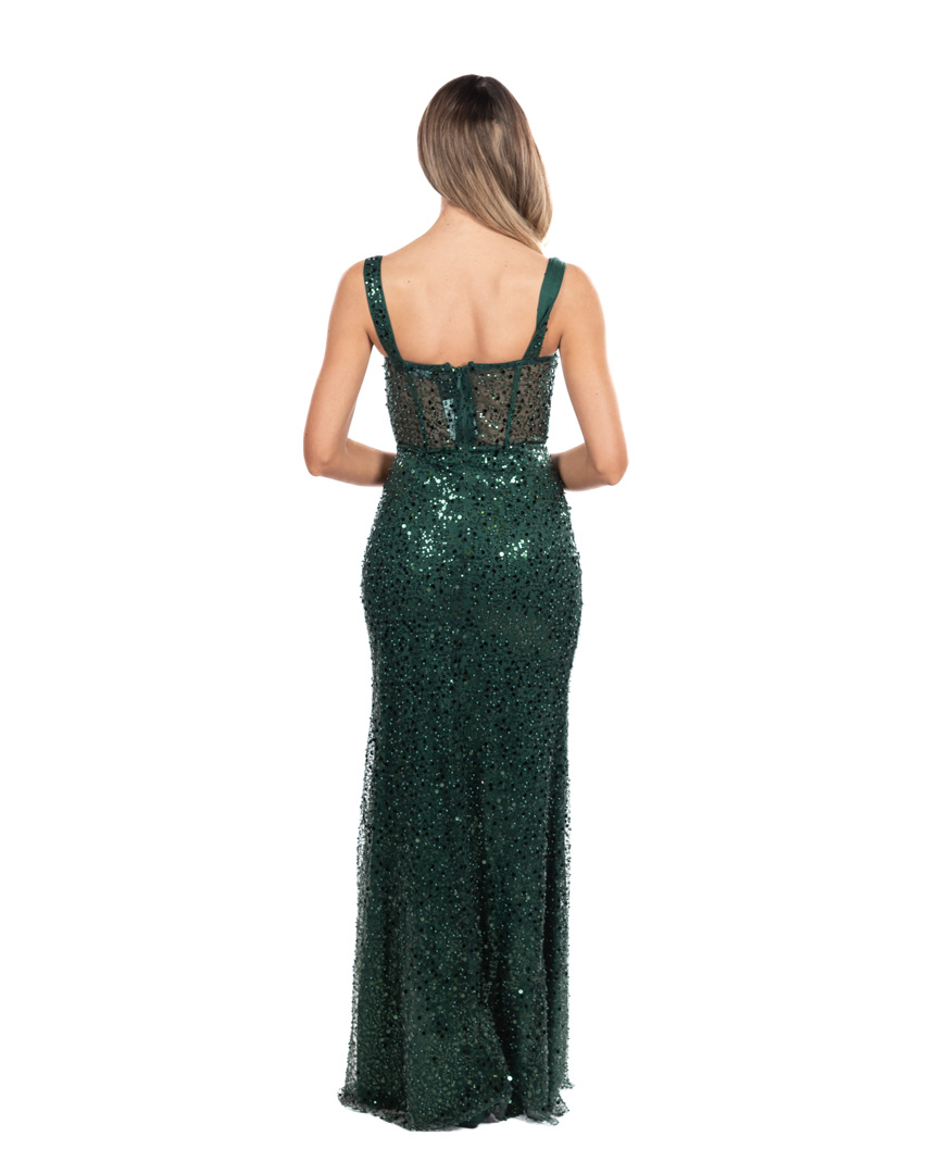 Il bustino strutturato scolpisce il décolleté e valorizza la silhouette, offrendo sostegno e una linea elegante, mentre le paillettes verde smeraldo catturano la luce a ogni movimento, regalando un effetto glamour e magnetico.