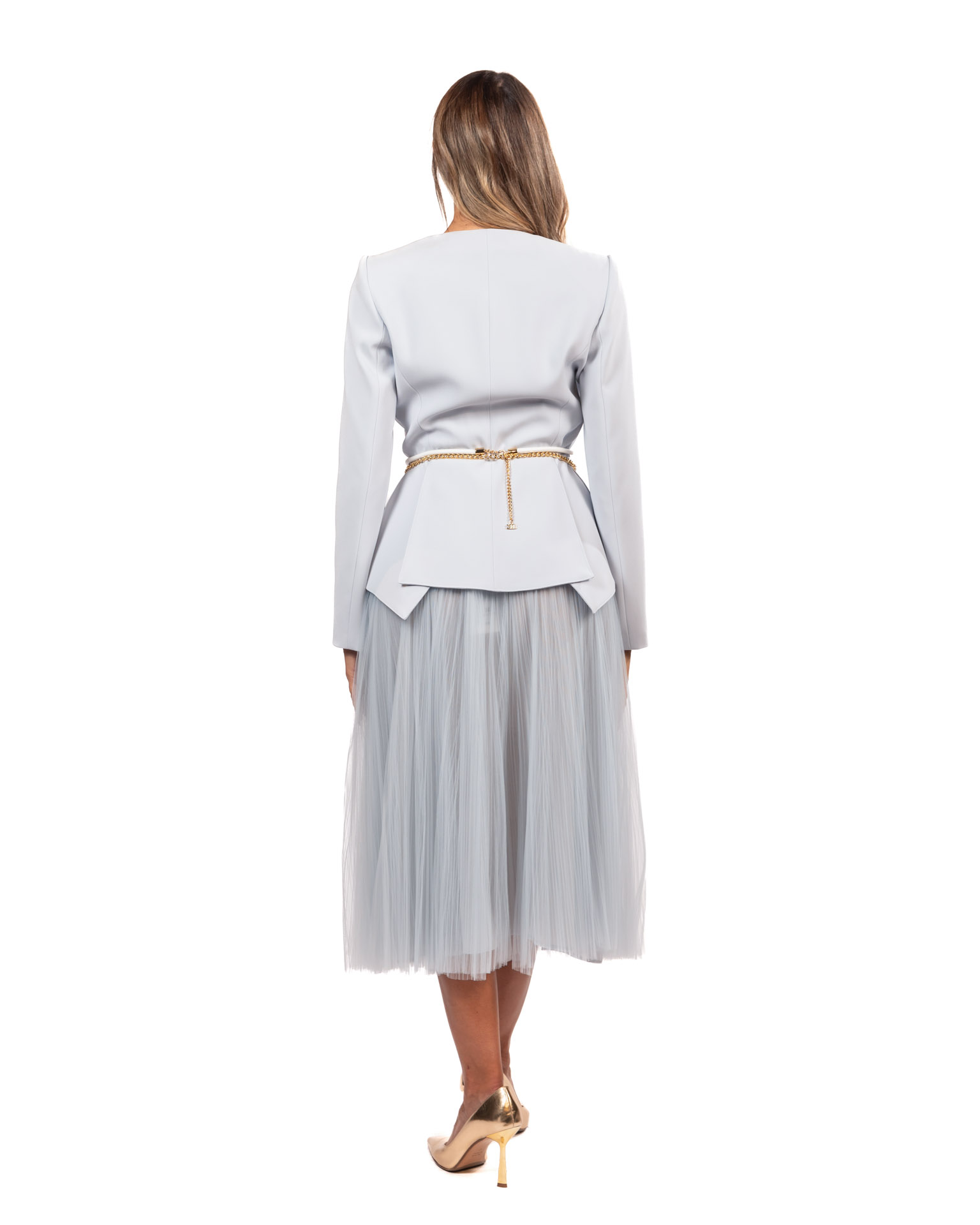 Giacca in crêpe leggero dalla vestibilità slim. Ha spalle strutturate e scollo incrociato con ampi spacchi al fondo che creano una baschina. La cintura tubolare posizionata in vita regala un tocco di luce.