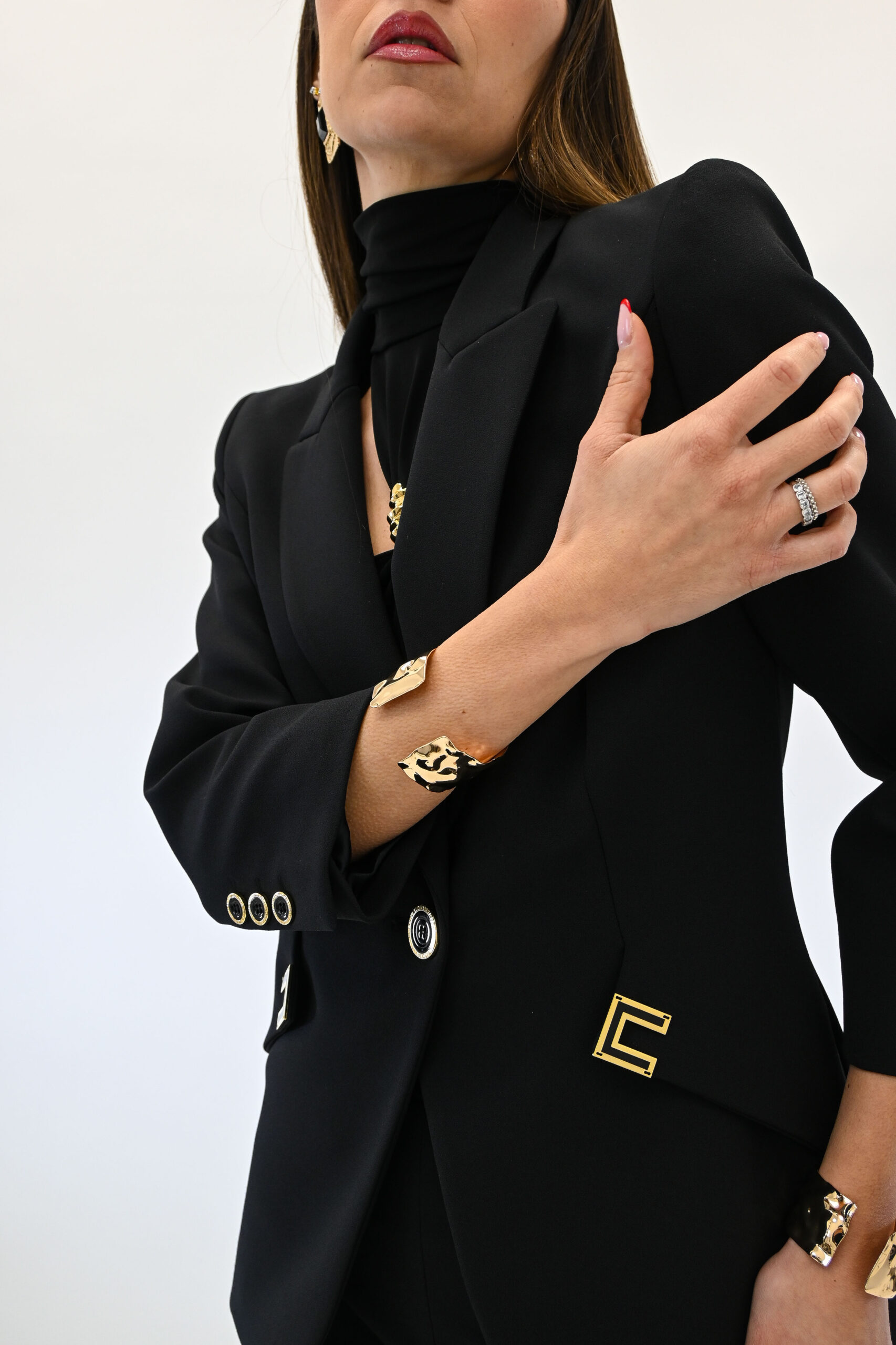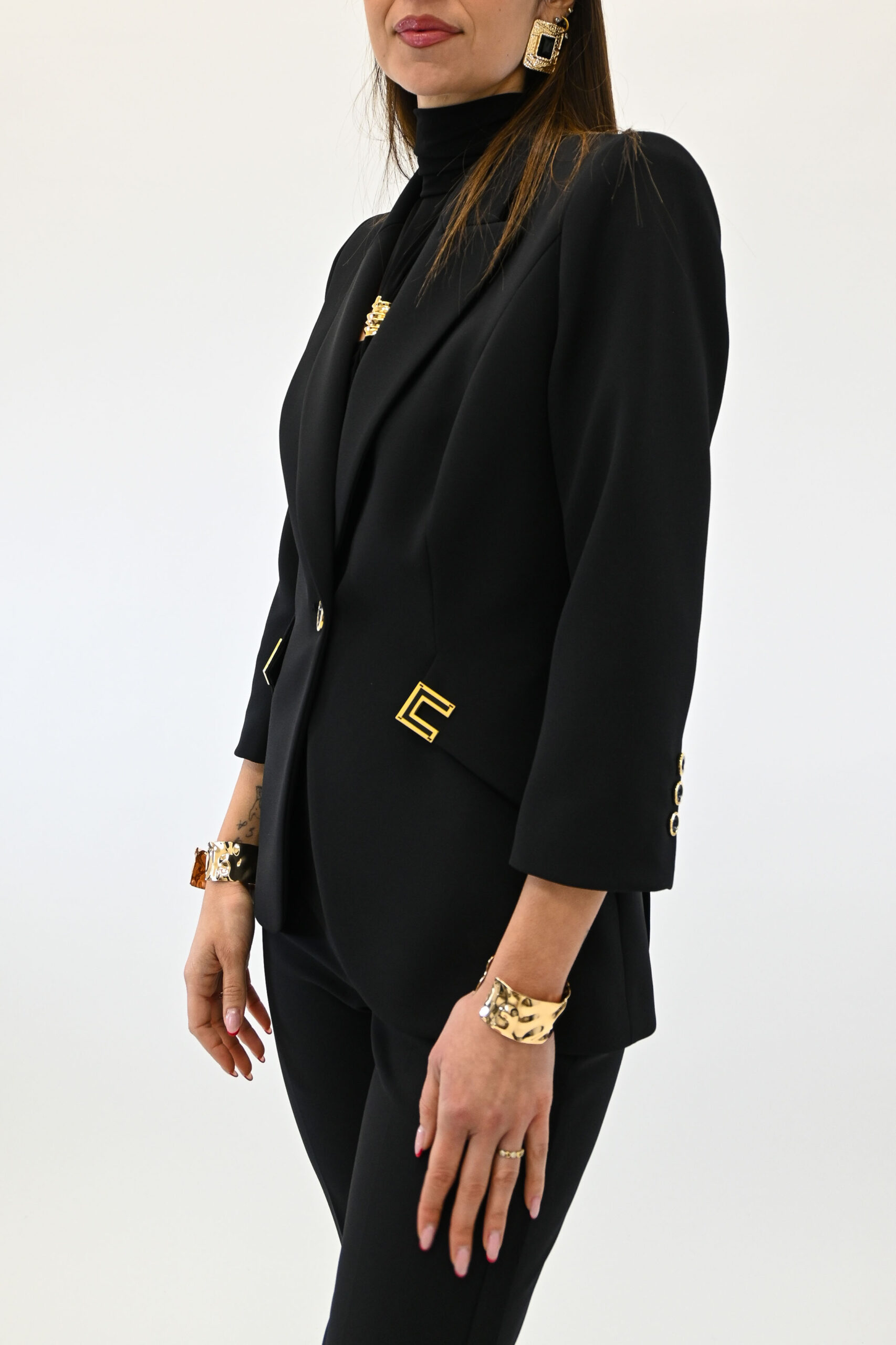Giacca in doppio crêpe stretch con spalle strutturate, rever a lancia e maniche ¾. Il blazer si distingue per i tagli diagonali sui fianchi, impreziositi dai dettagli con logo in metallo dorato e smaltati internamente. Vestibilità slim.