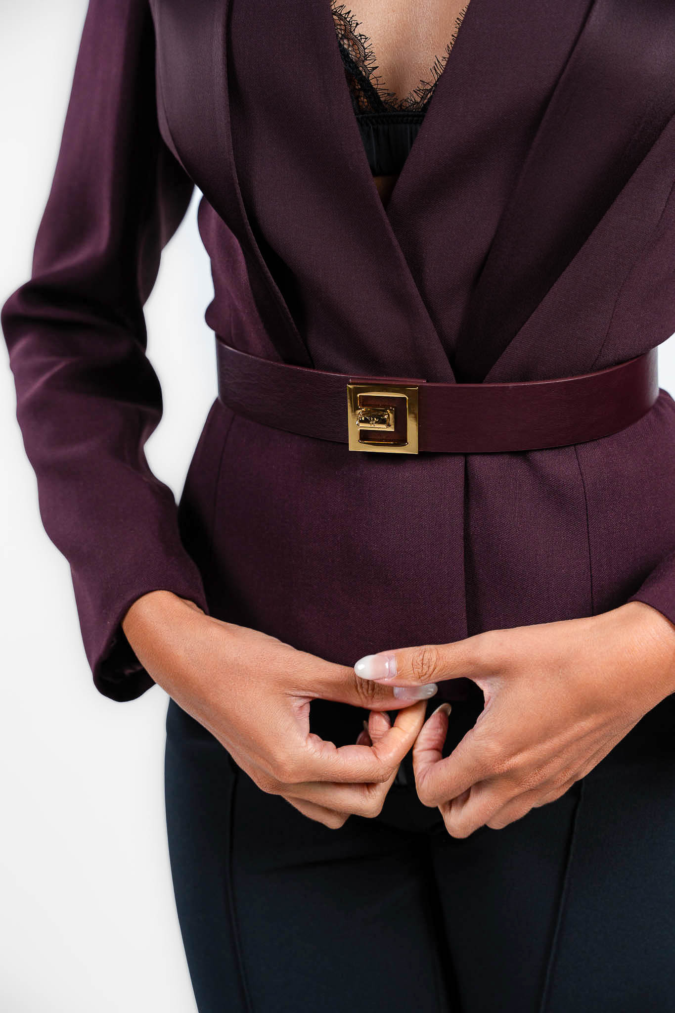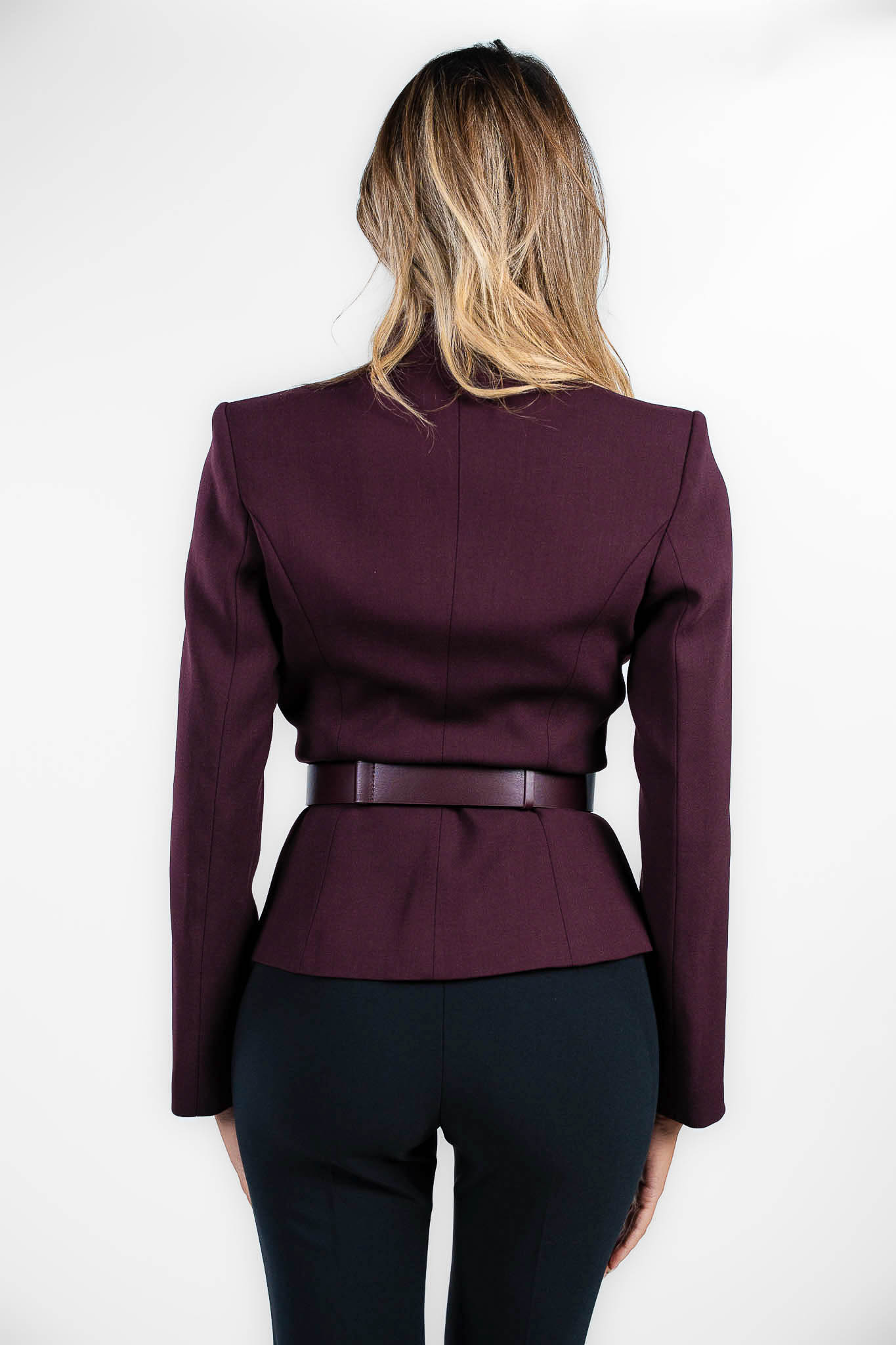Giacca in crêpe dalla vestibilità slim. Il blazer ha collo sciallato e si distingue per il doppio rever realizzato in raso, intarsiato e in tono per creare interessanti contrasti di texture. La baschina con cintura in vita regala una silhouette decisa e armoniosa.