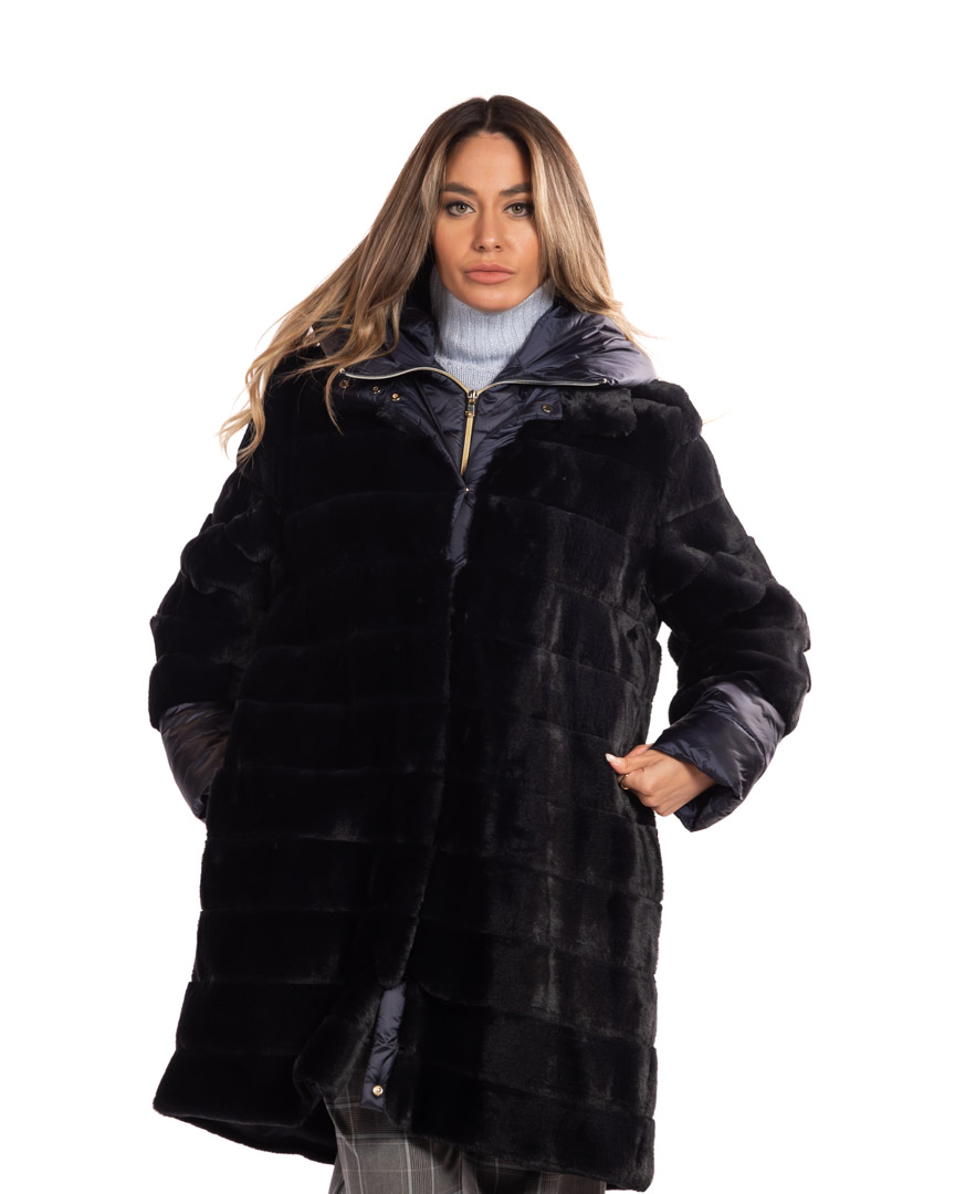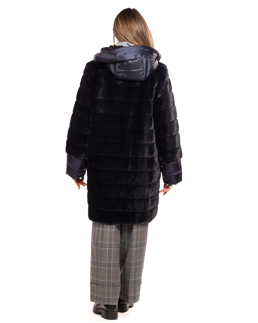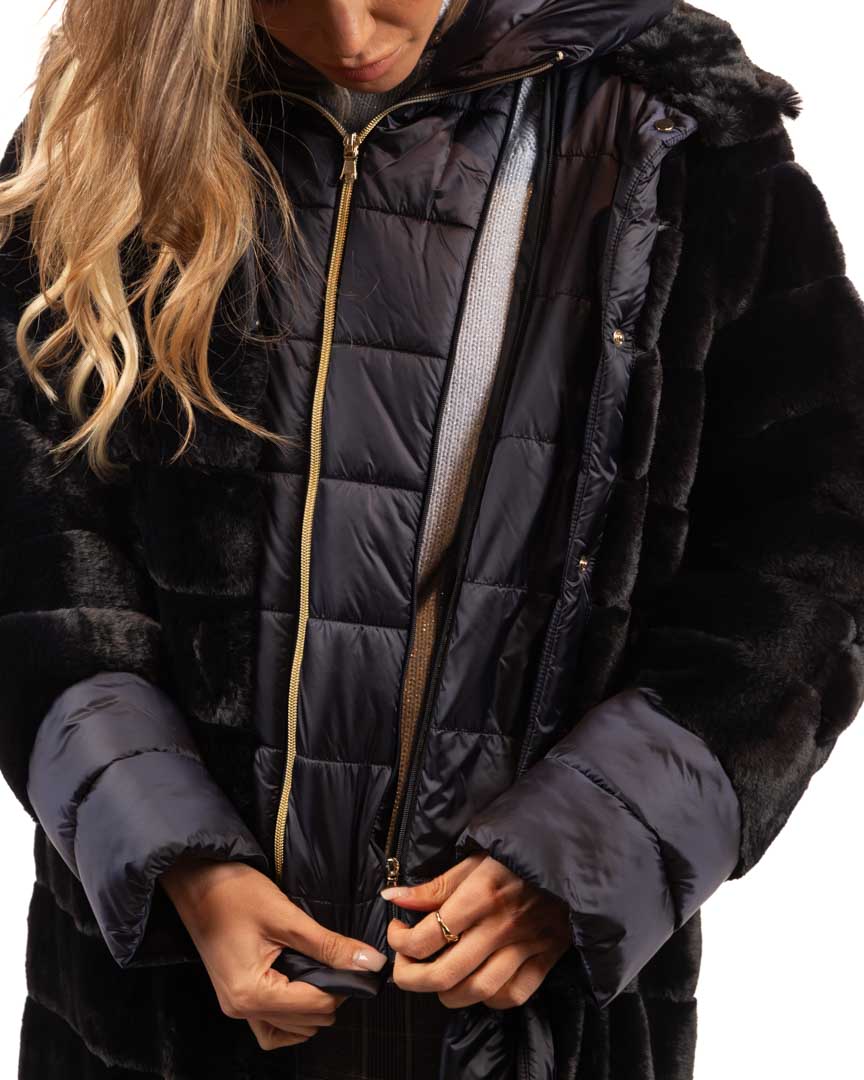 Il modello è perfetto per la stagione invernale, pensato con una pettorina trapuntata interna, facilmente rimovibile, a cui è agganciato anche il cappuccio. Due tasche laterali. Imbottitura in poliestere. Maniche lunghe con polsino in tessuto trapuntato, a riprendere la pettorina interna e il cappuccio. Chiusura frontale con bottoni automatici.