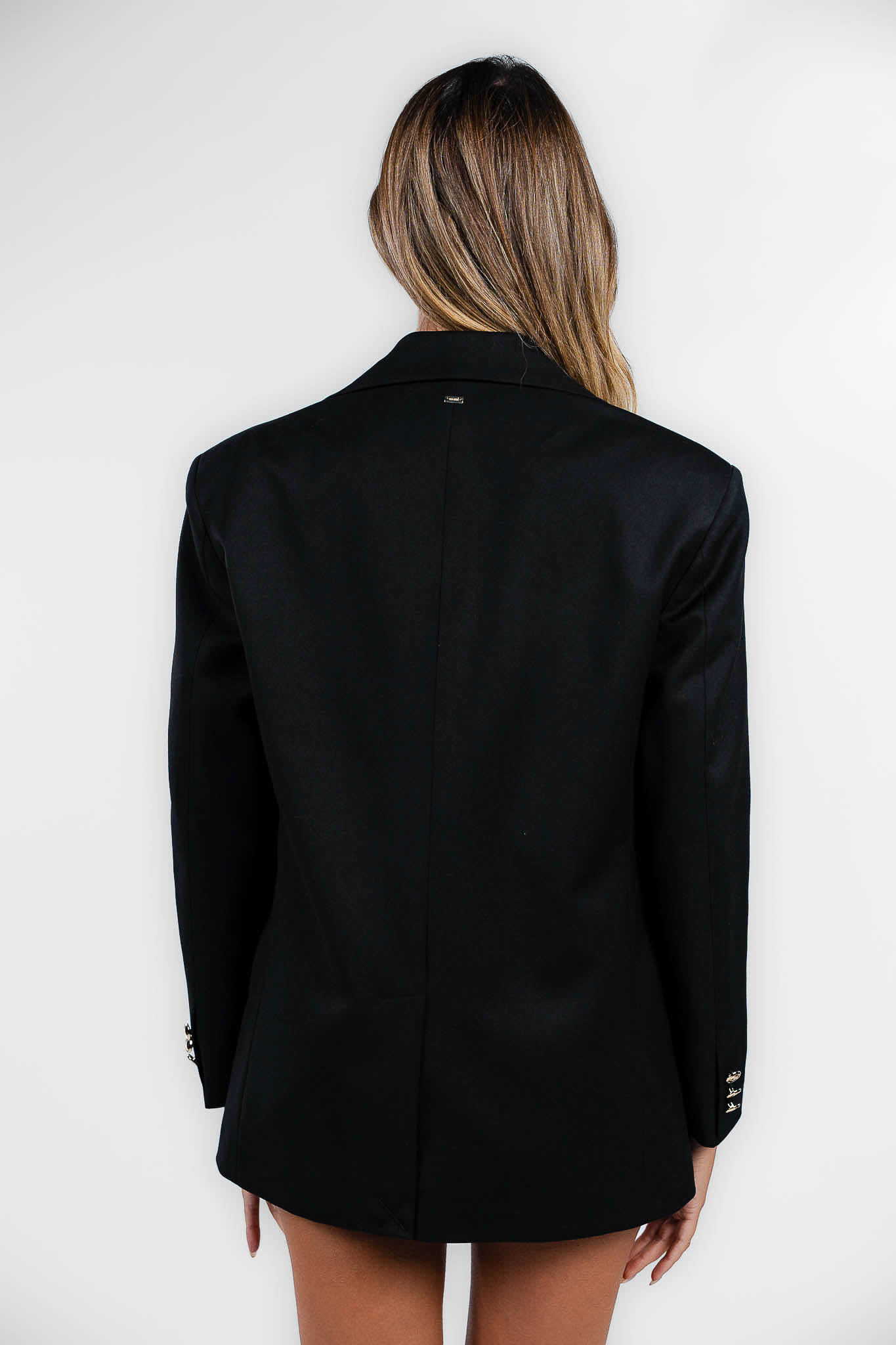 Scegli il blazer in misto viscosa elasticizzata con revers classico e bottoni dorati. Relaxed fit per un’eleganza minimal chic.