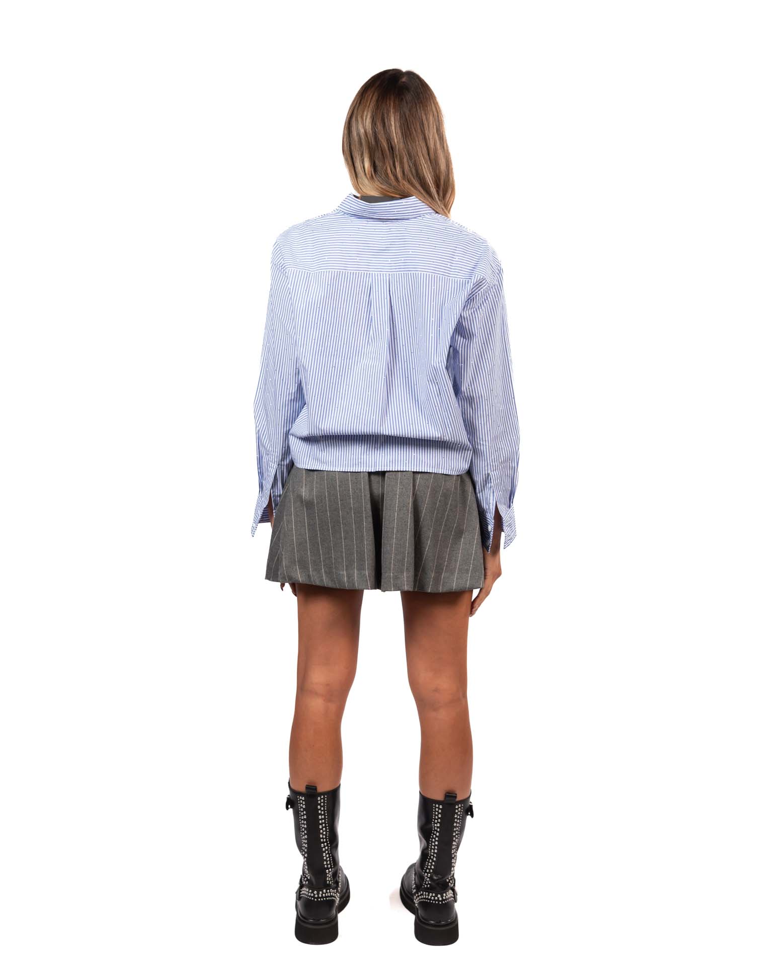 Il taglio cropped la rende ideale da abbinare a denim a vita alta o gonne, mentre il mix di elementi – righe pulite e applicazioni brillanti – crea un equilibrio perfetto tra essenzialità e femminilità.