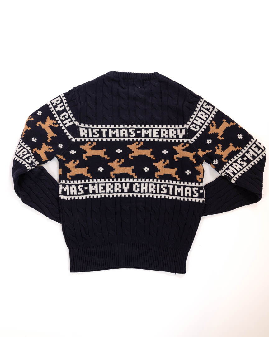 Maglione blu con motivo natalizio, elegante e discreto. Ideale per look invernali raffinati.