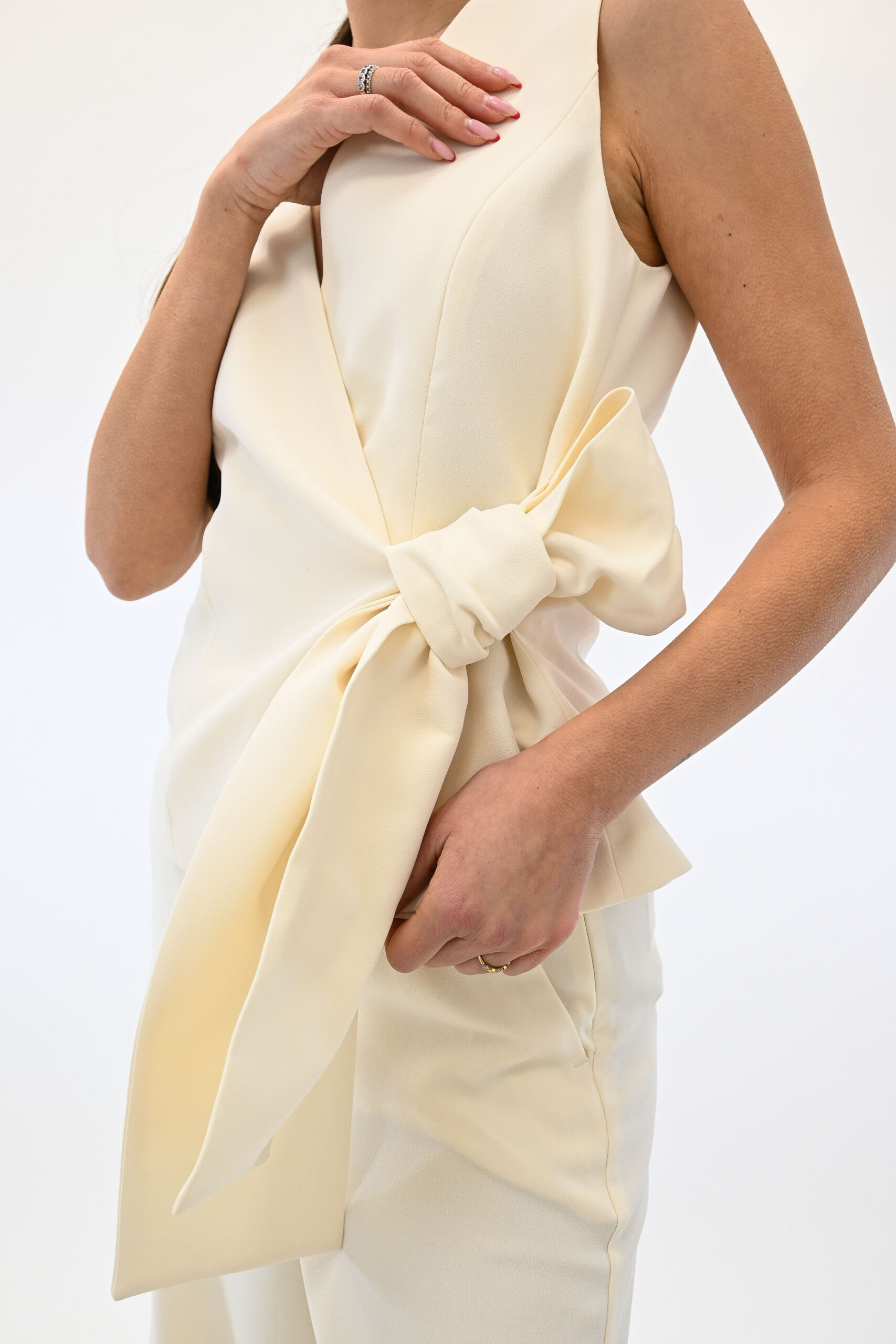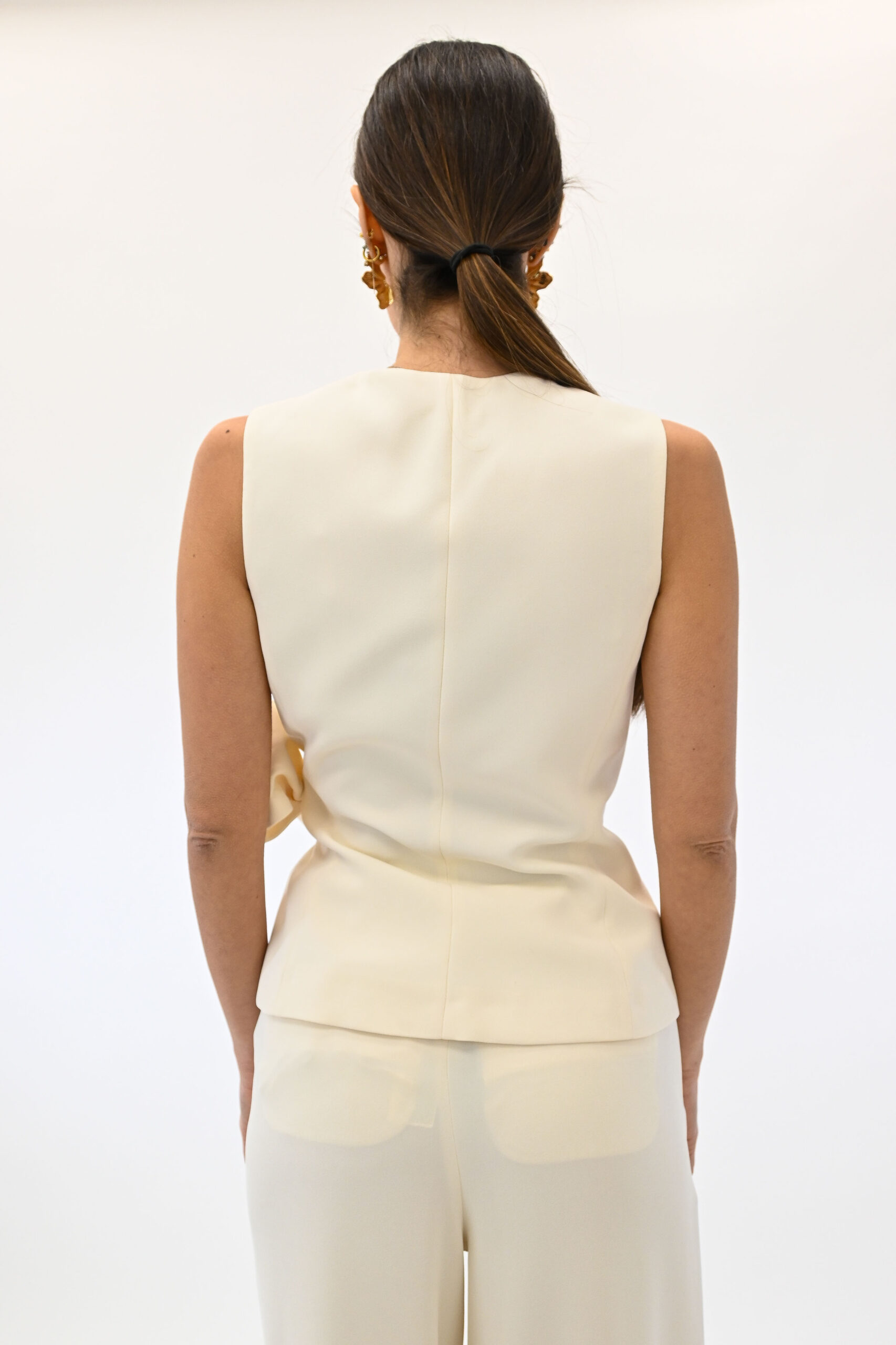 Eleganza senza compromessi con questo top smanicato in un fluido envers satin. La chiusura incrociata con fiocco laterale attira lo sguardo sul punto vita, in un gioco di femminilità e linee attuali.
