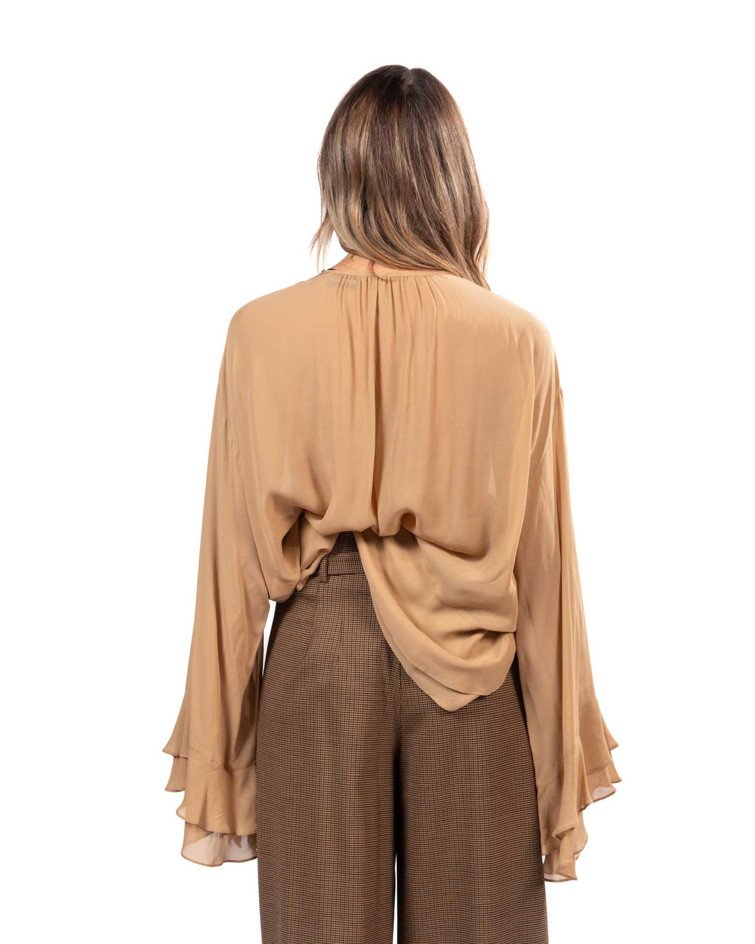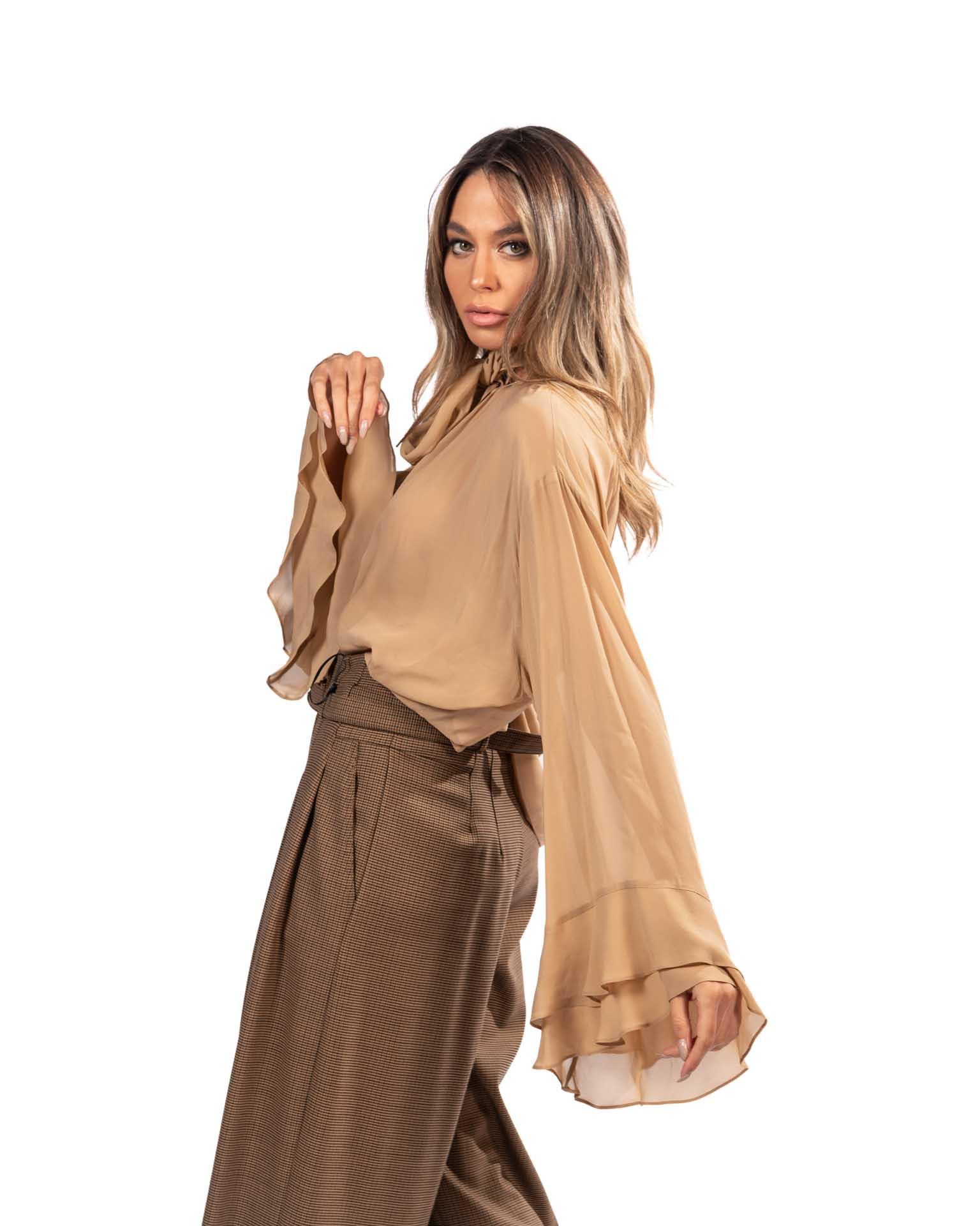 Blusa in georgette dall’allure elegante, facile da personalizzare grazie alla fascia da annodare al collo. La doppia balza al fondo regala leggerezza, perfetta per mix quotidiani con i denim o momenti più raffinati con la gonna coordinata.