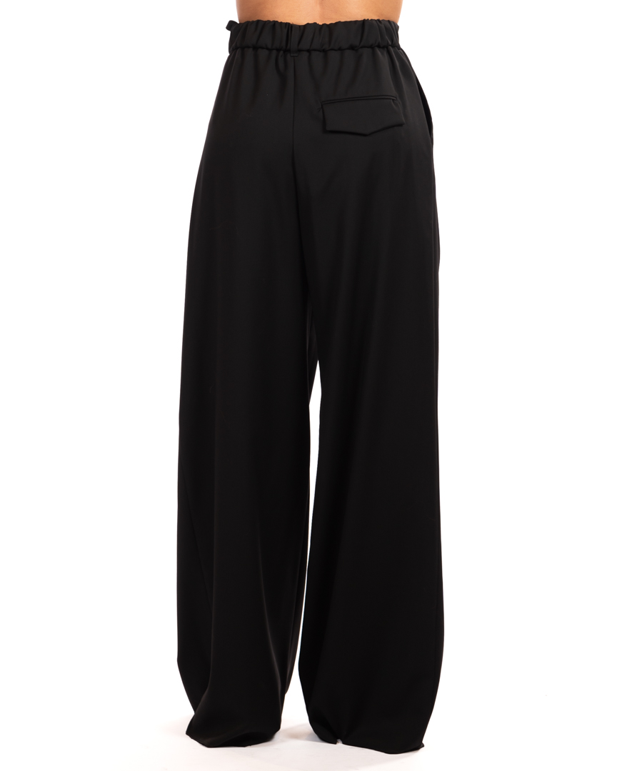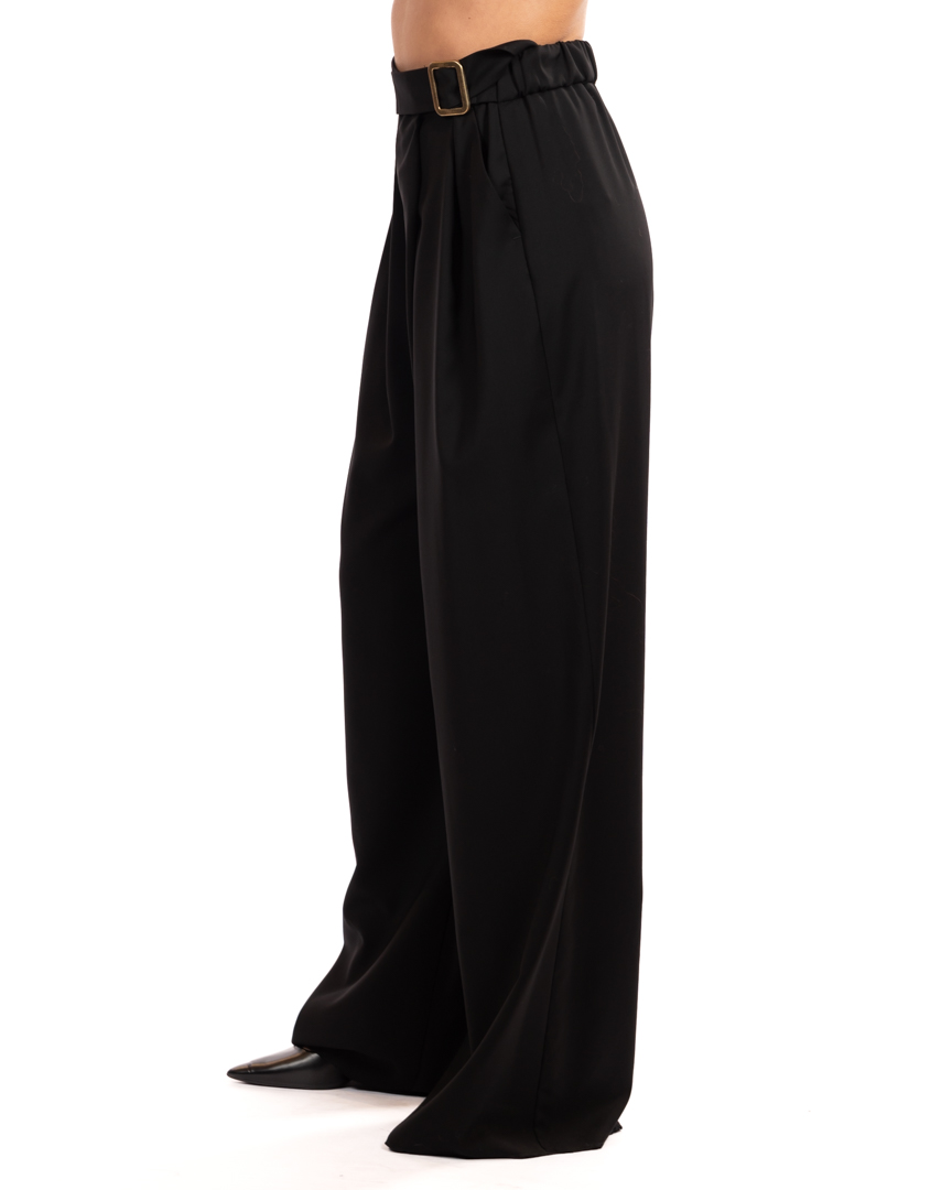 Evoluzione cool del pantalone a vita alta, con volume ampio sulla gamba per una silhouette slanciata. Il dettaglio della cintura in vita con fibbia metallica aggiunge quella giusta nota casual che definisce il look.