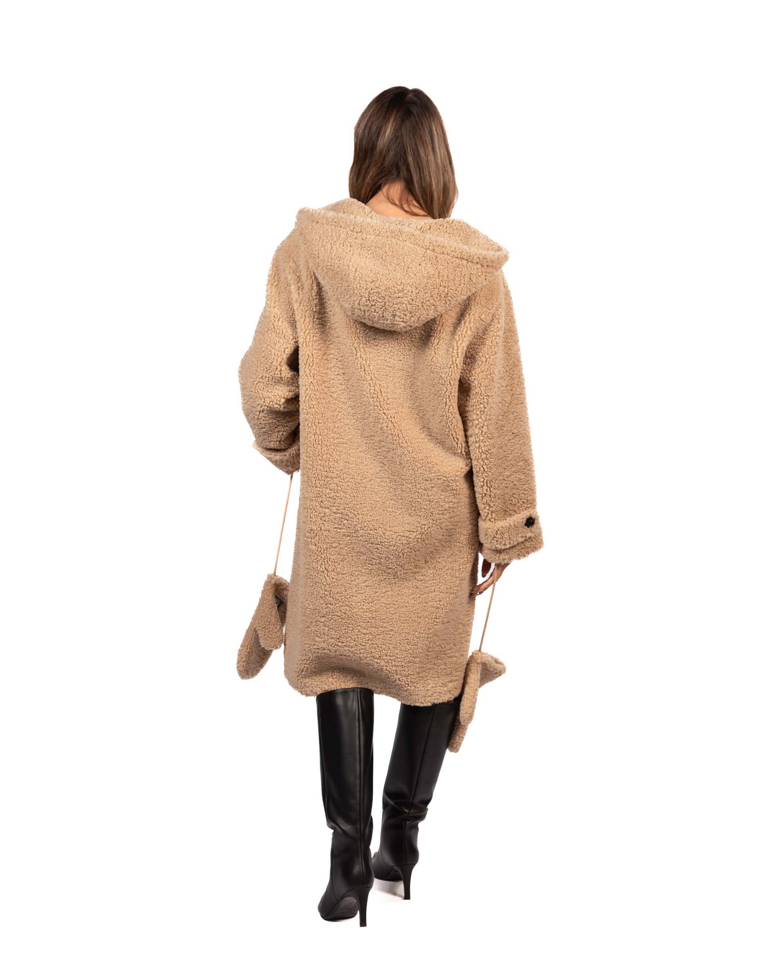Cappotto lungo donna reversibile Montereggi in eco-montone e teddy con cappuccio.