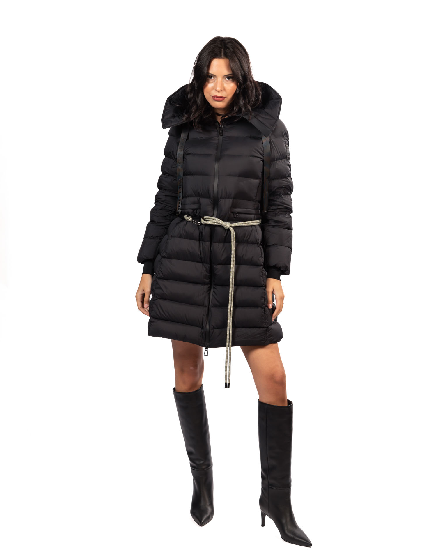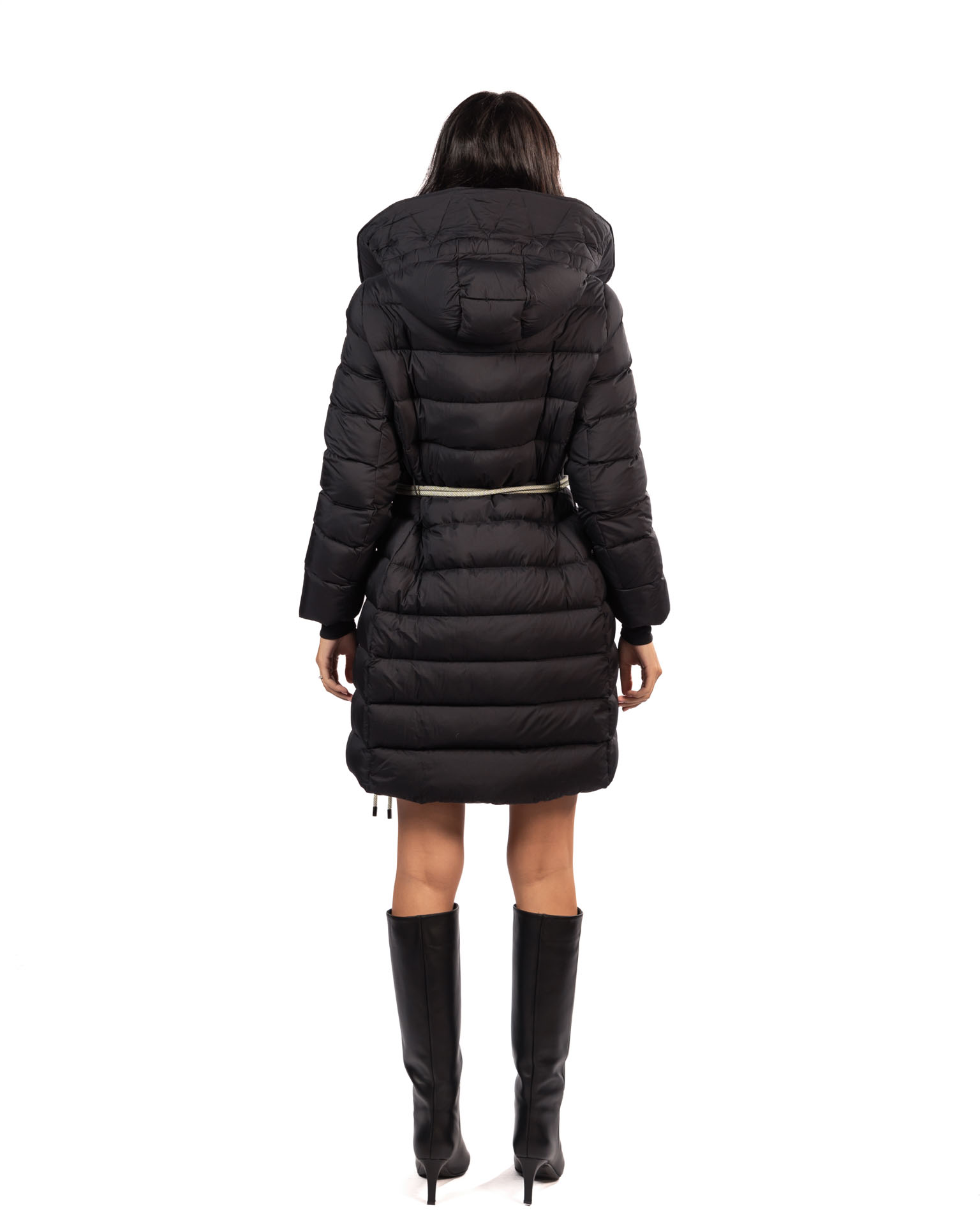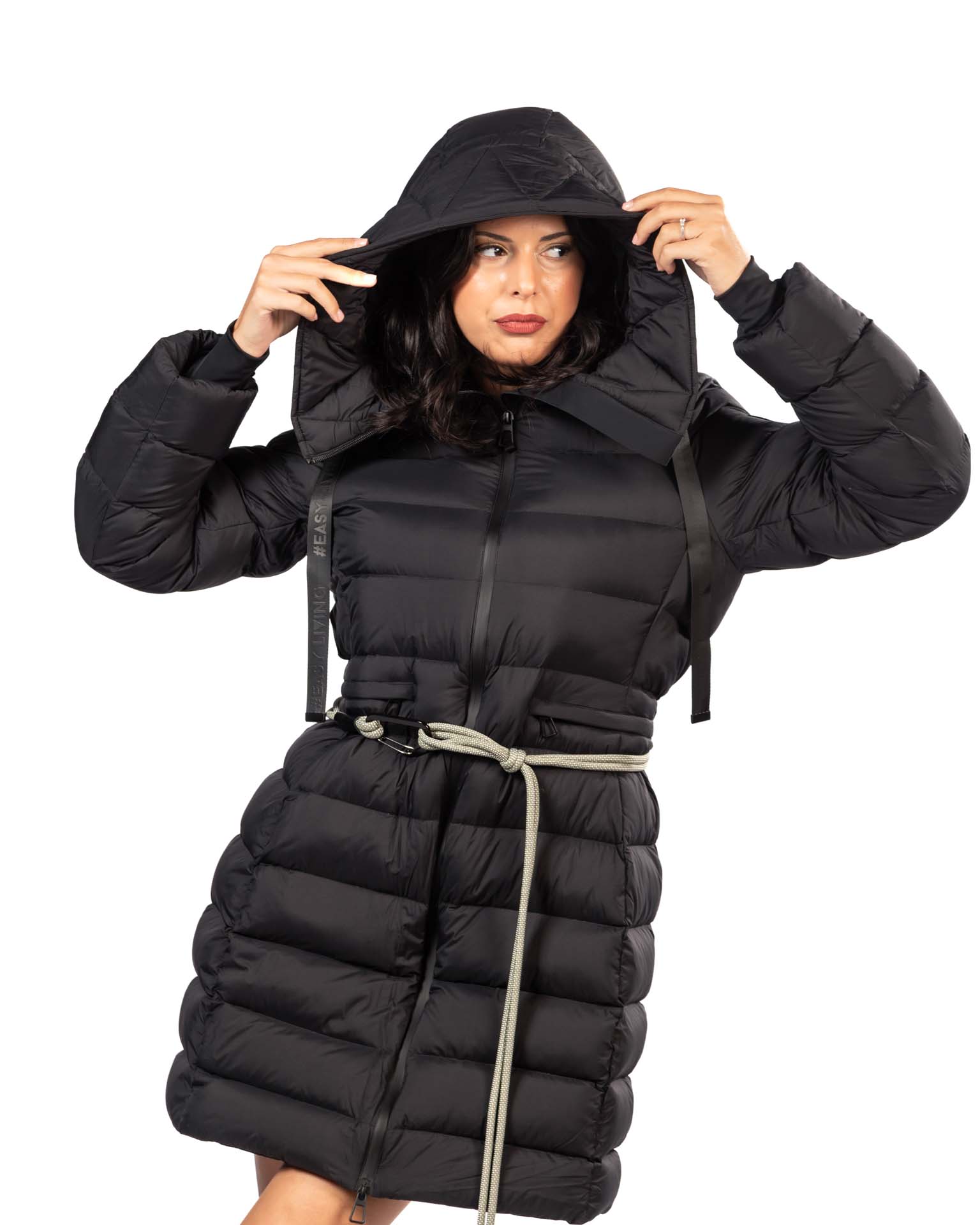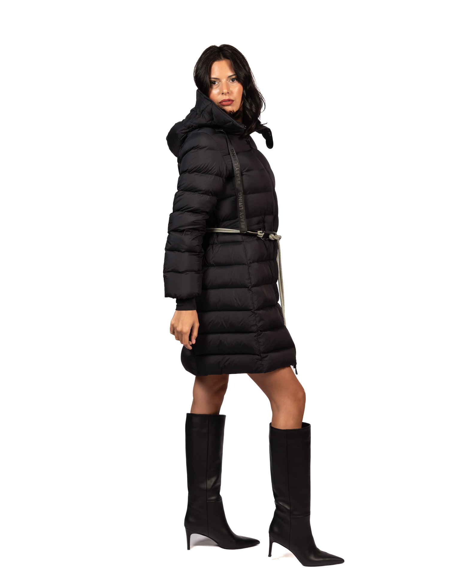 Accogli l’inverno con eleganza grazie a questo giubbino invernale da donna Montereggi in colore nero, perfetto per dare un tocco di eleganza ai tuoi look.Il modello è arricchito da una cintura in vita, che valorizza la silhouette con un tocco raffinato e sagomat