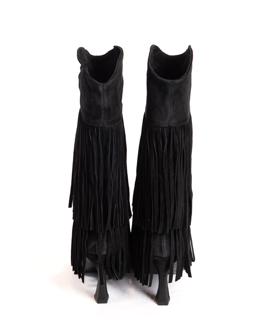 Realizzato in morbido camoscio nero, questo stivale camperos da donna è l’accessorio perfetto per chi ama distinguersi con personalità. Le frange laterali donano movimento e carattere al look, mentre la punta leggermente affusolata e il tacco medio slanciano la figura garantendo comfort per tutto il giorno.
