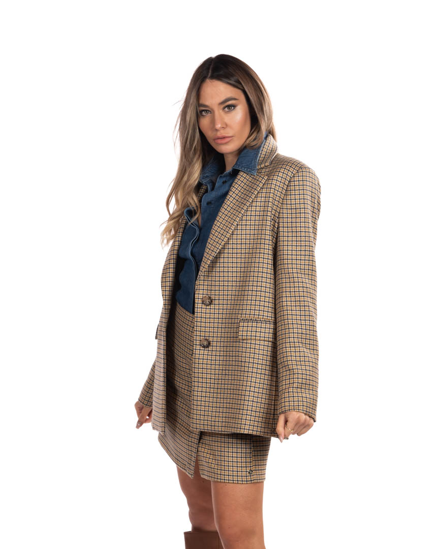 Ha tutto il fascino dei classici sartoriali maschili: il blazer in pura lana è un caposaldo del guardaroba. Pura lana a disegno tinto in filo Taglio monopetto a due bottoni Linee diritte sul davanti, leggermente avvitate sul retro Collo a revers Tasche a pattina Spacco sul retro, spacchetti con bottoni ai polsi Capo foderato Minigonna coordinata in collezione