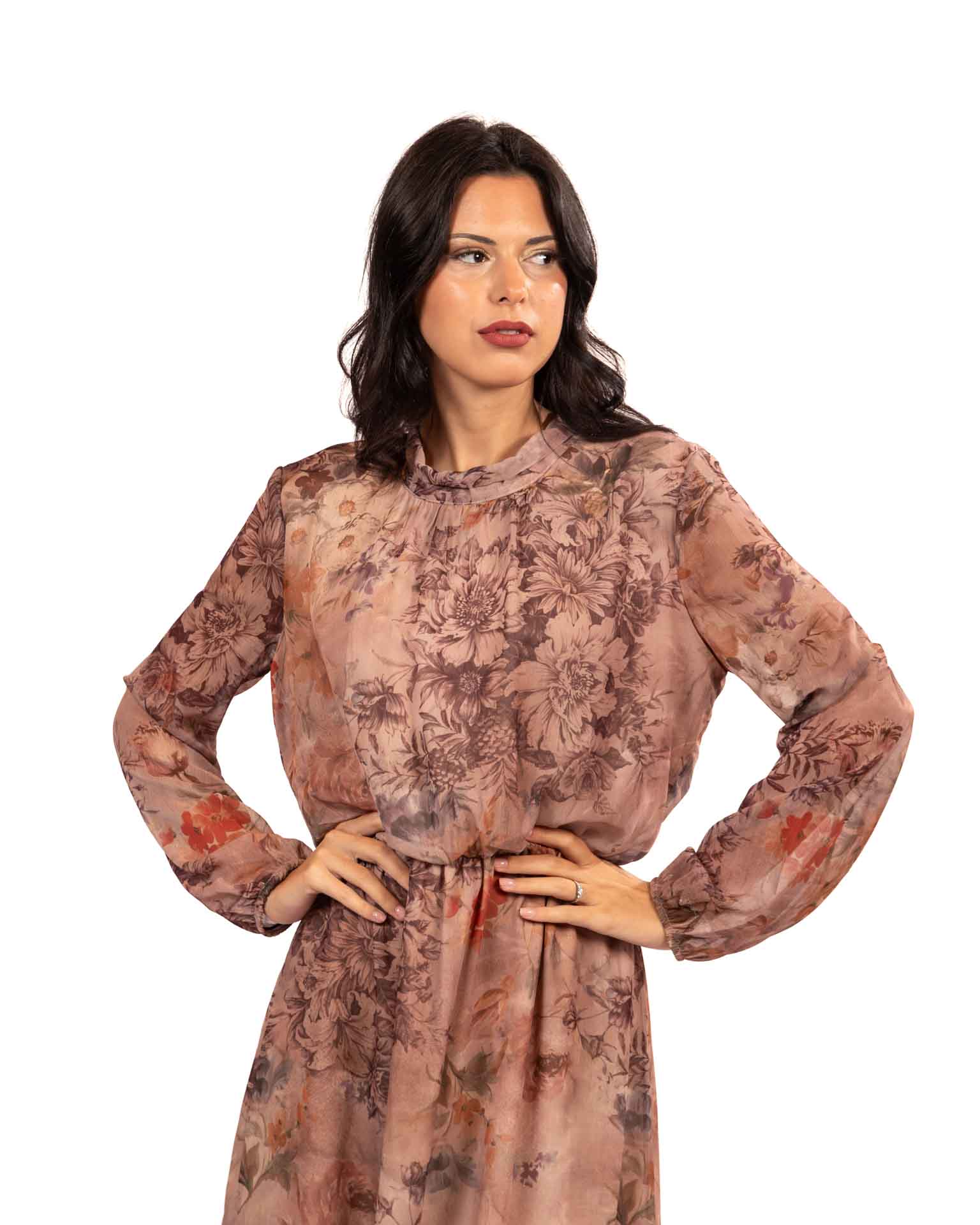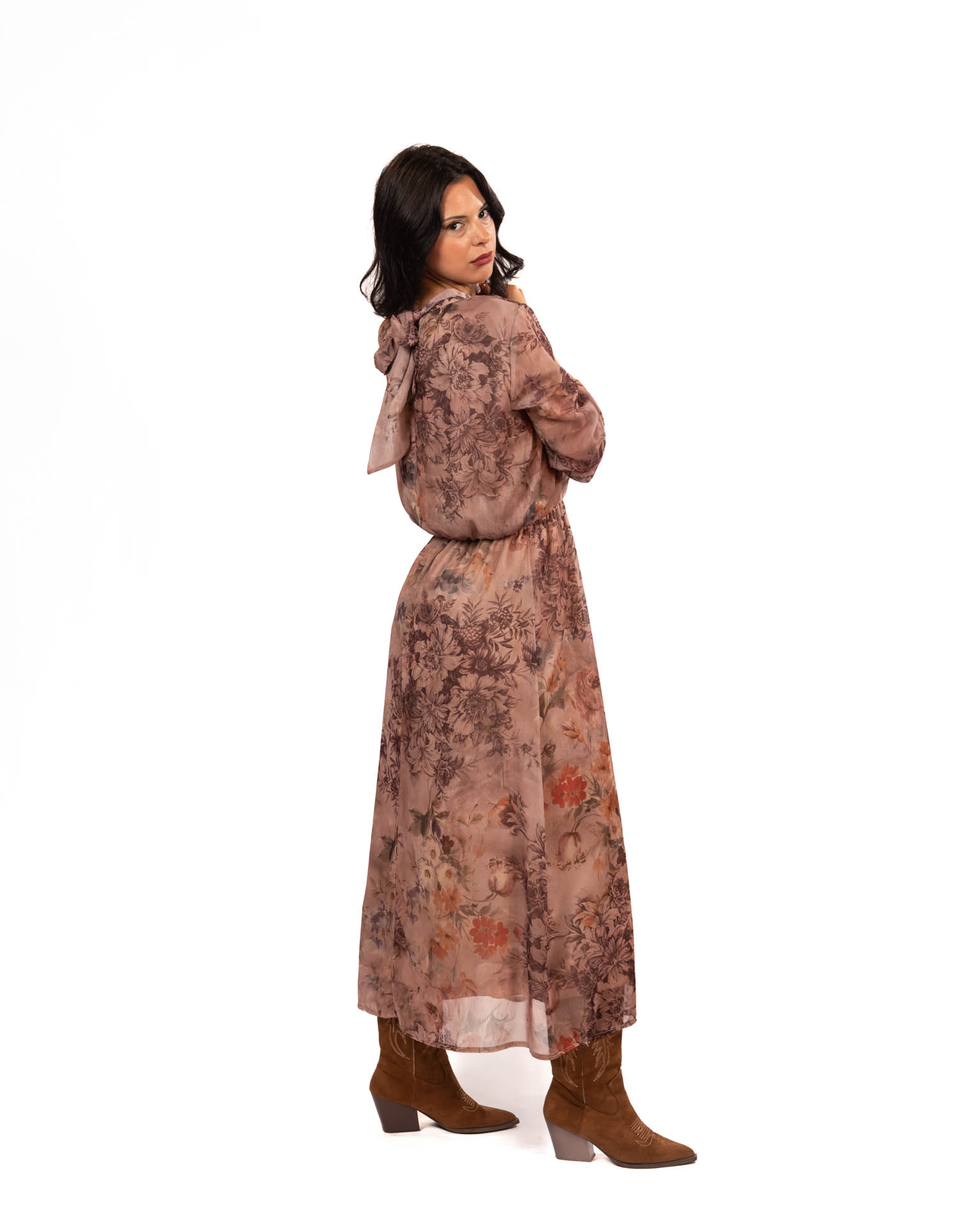 Romanticismo e stile si incontrano in questo abito lungo firmato Rinascimento, caratterizzato da una raffinata fantasia floreale declinata nei toni delicati del rosa antico e del marrone. Un capo fluido, femminile e perfetto per occasioni eleganti, cerimonie o eventi serali.