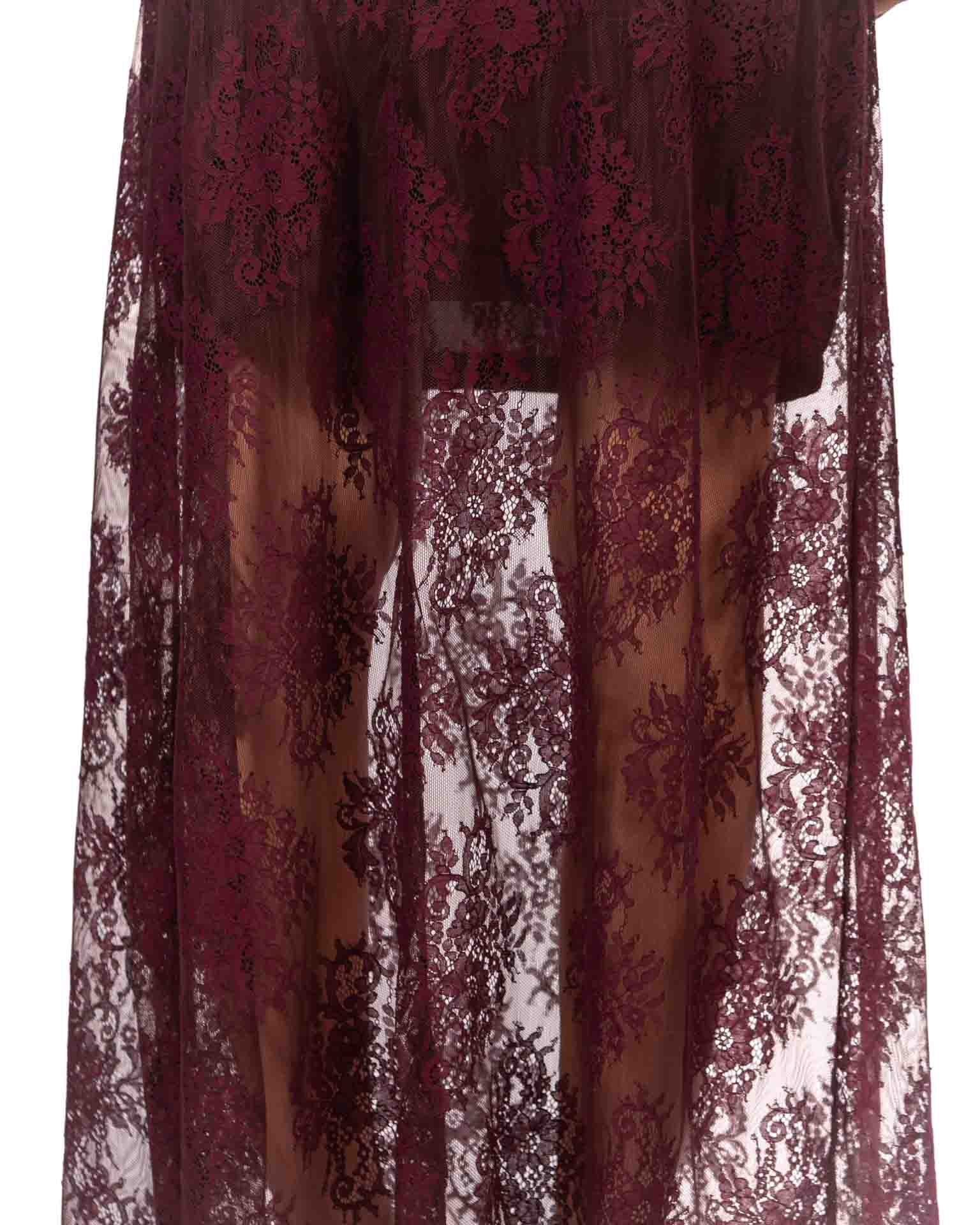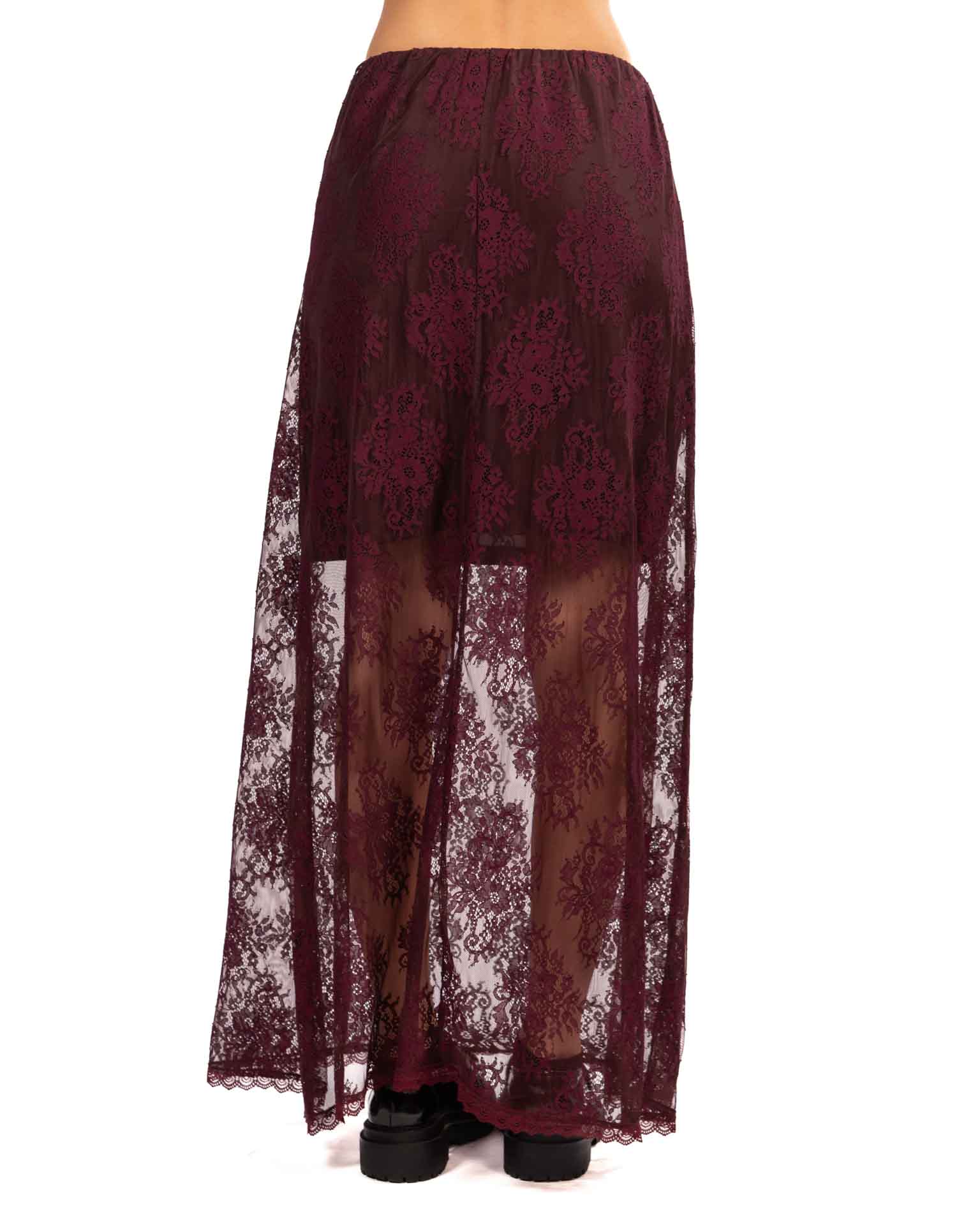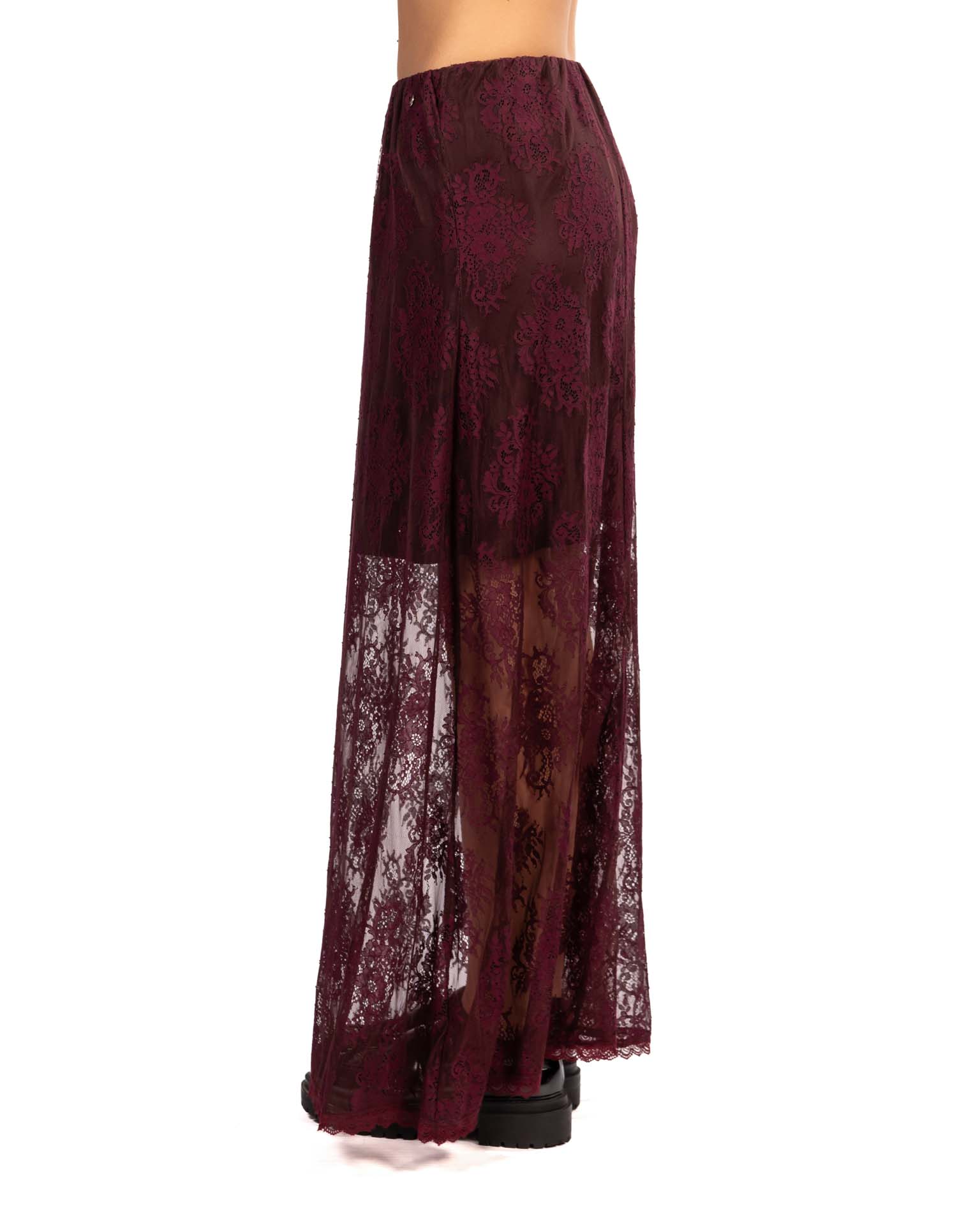 Romantica e sofisticata, questa gonna in pizzo bordeaux è un capo che unisce eleganza e praticità. Il delicato motivo in pizzo floreale è valorizzato da una sottoveste tono su tono, che garantisce copertura e comfort, mantenendo la trasparenza solo dove serve.