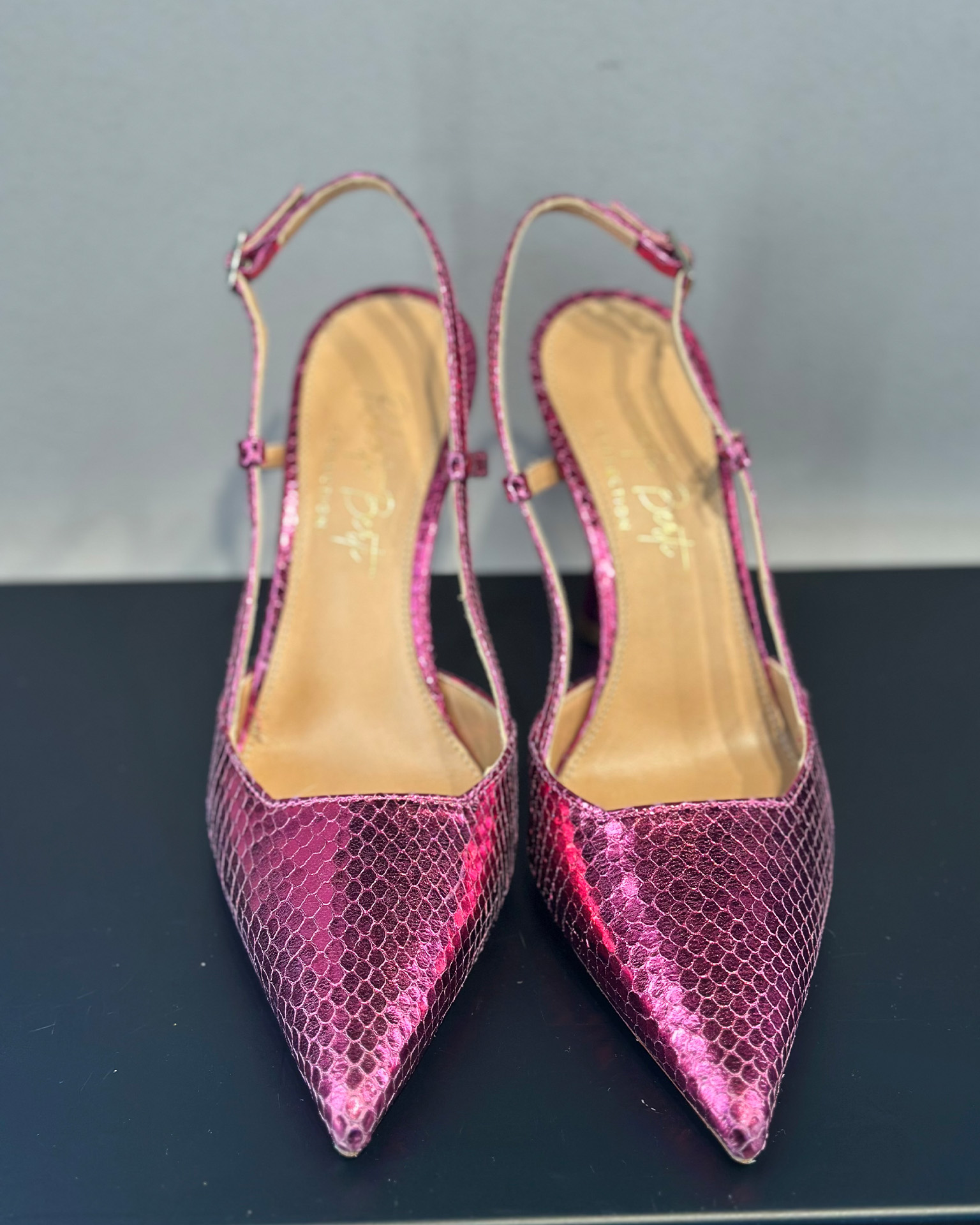Dai un tocco di carattere al tuo look con questa décolleté dal design audace e femminile. Realizzata in materiale laminato fuxia, cattura la luce e lo sguardo con ogni passo. La punta effetto pitonato aggiunge una nota grintosa e sofisticata, perfetta per chi ama distinguersi.