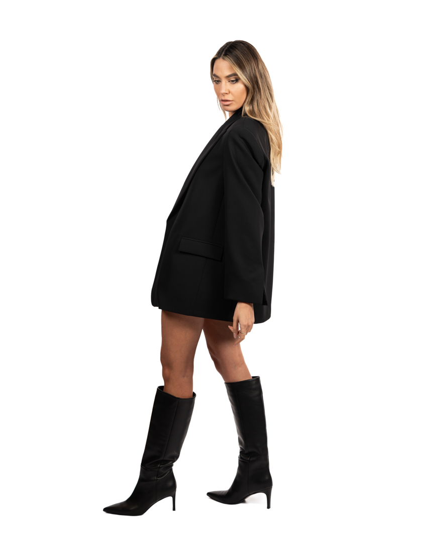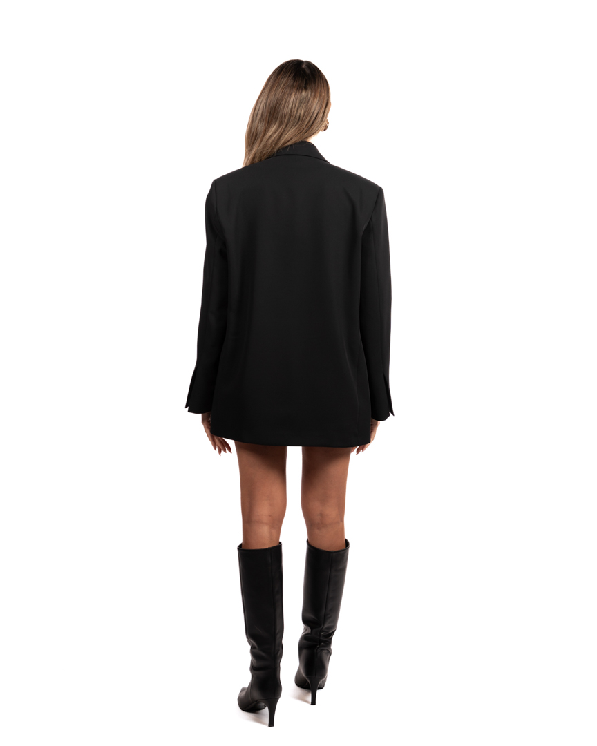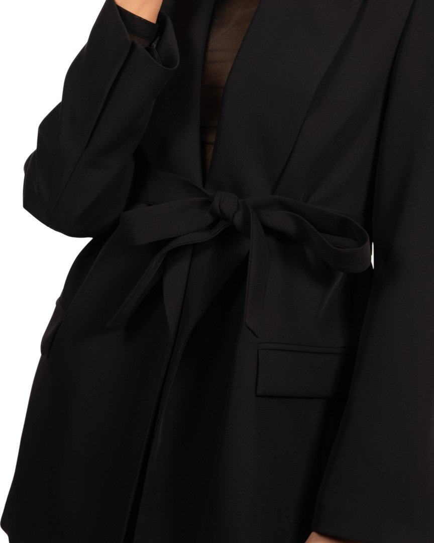 l blazer della collezione autunno/inverno di Vicolo si distingue per la sua costruzione essenziale e raffinata: rever ampio, chiusura con fusciacca che stringe delicatamente il punto vita, tasche a patta e lunghezza estesa che slancia la figura. L’estetica minimale lo rende ideale da indossare sia aperto che annodato, per interpretazioni moderne ed eleganti.