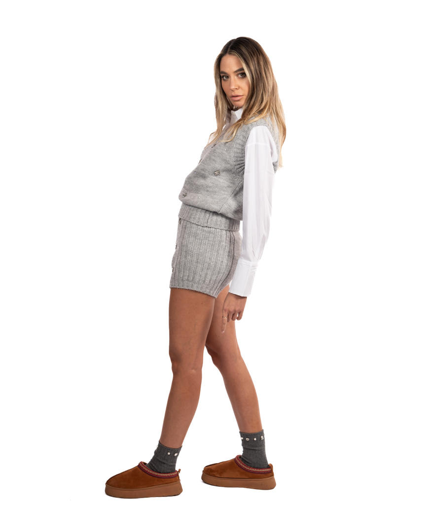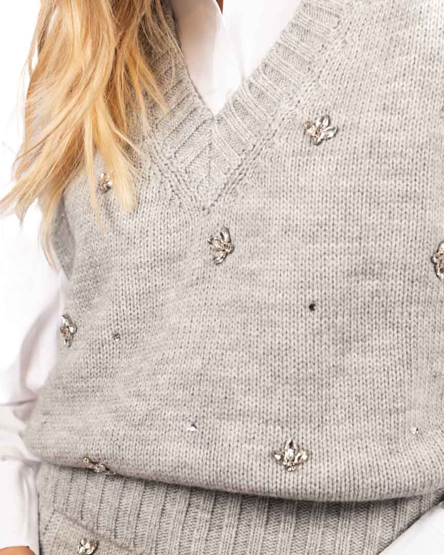 Gilet scollo a v fit boxy con cabochon. Finiture in maglia a coste.