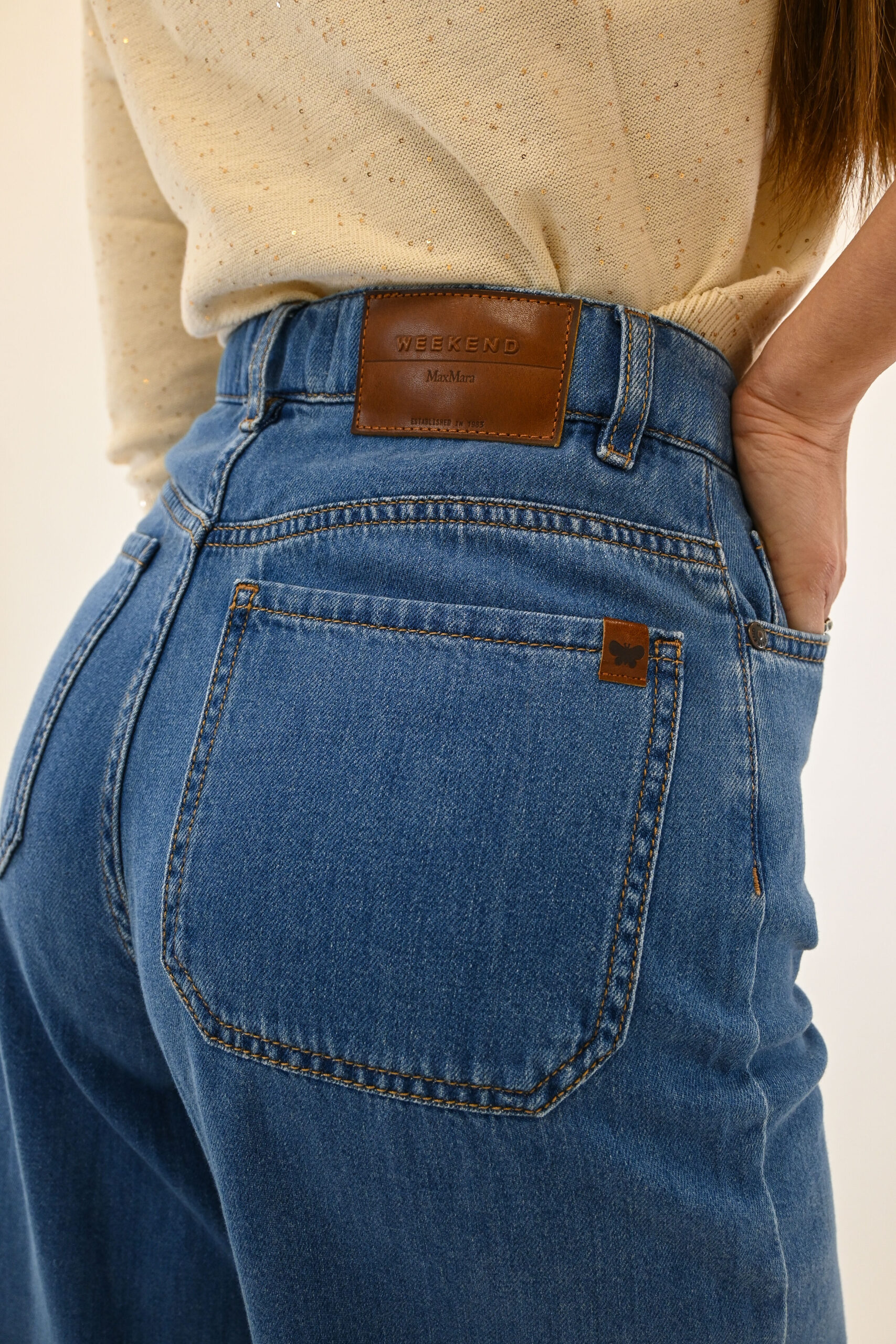 Jeans 5 tasche dalla silhouette wide leg, personalizzato da label con logo a farfalla sulla tasca posteriore destra.