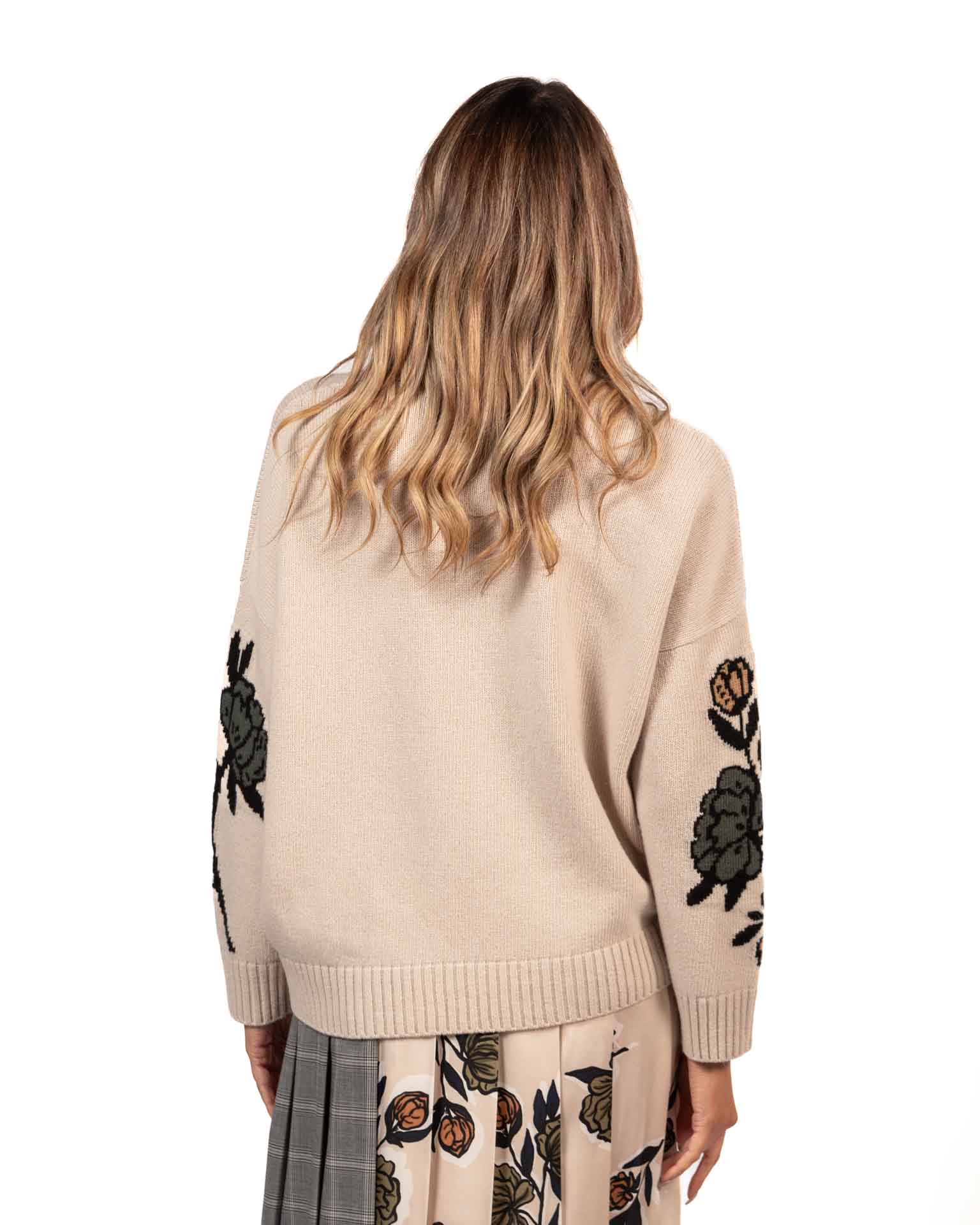 Maglia oversize decorata con una lavorazione intarsio con disegni di collezione davanti e sulle maniche.