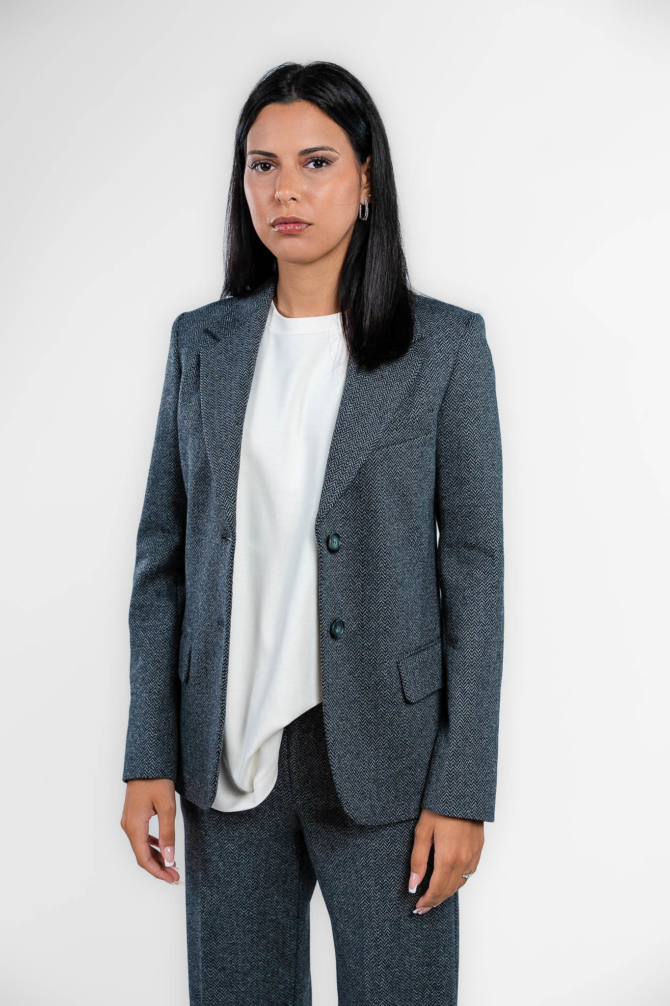 Blazer monopetto d’ispirazione maschile.Blazer in jersey di mista lana e cotone Linea leggermente sfiancata Collo a rever Maniche lunghe a giro Chiusura frontale con due bottoni a vista Taschino sul petto e tasche con patta applicata sul davanti Foderato