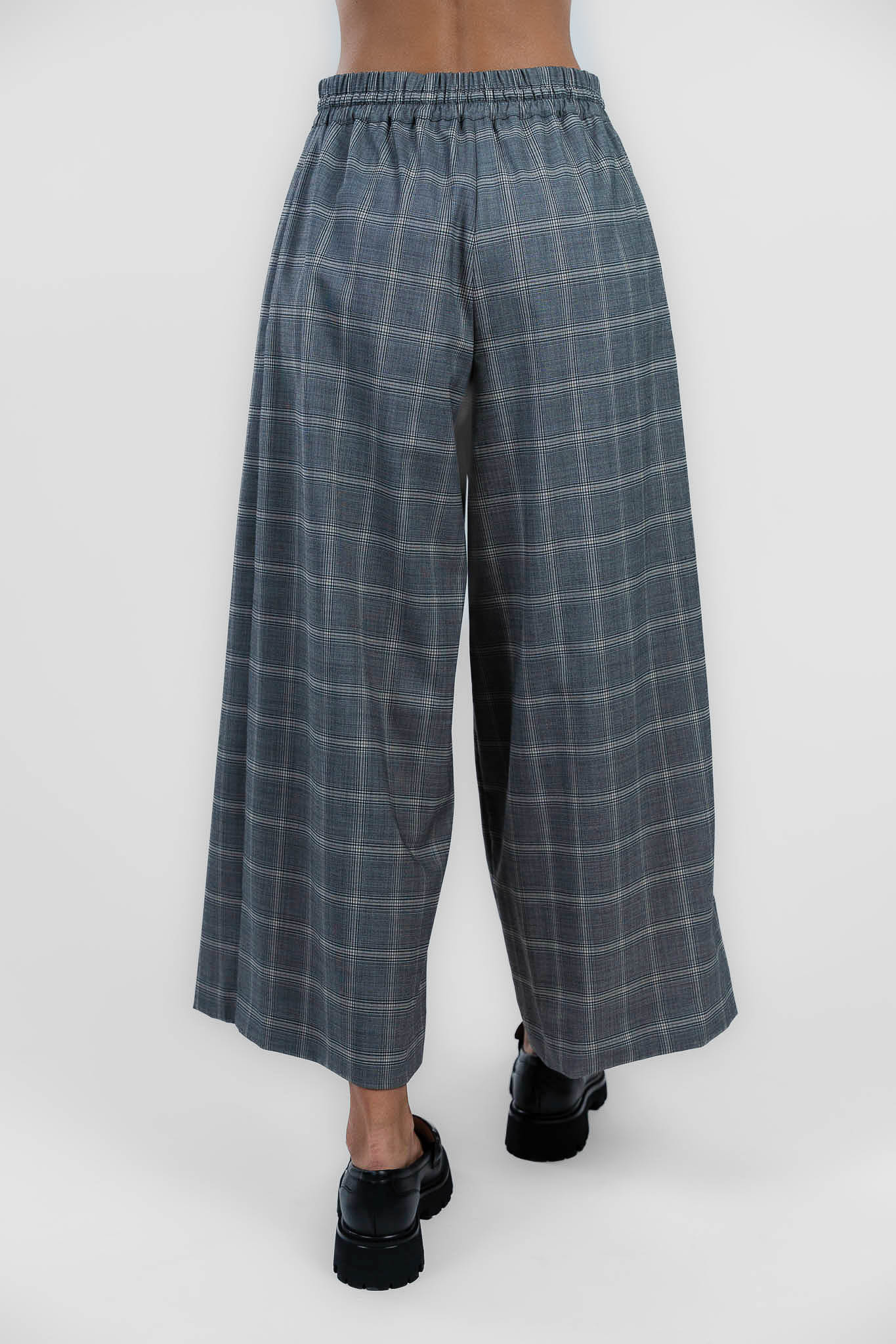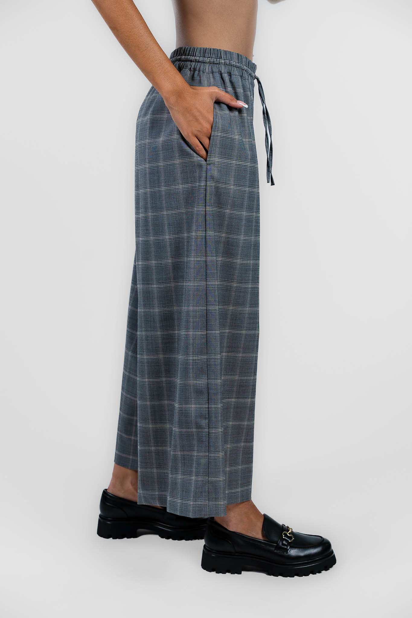 Pantalone cropped alla caviglia, proposto in fantasia Principe di Galles. Pantalone in batavia di lana tecnica tinto filo Gamba larga Vita elasticizzata con coulisse regolabile Tasche inserite nei fianchi